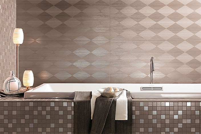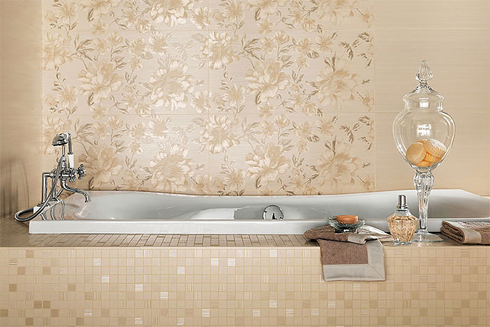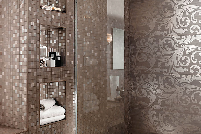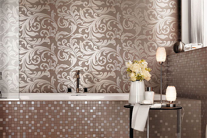 Декоры Brilliant Acanthe – это переплетающиеся листья, узоры, мерцающие при попадании на них света. Основная плитка матовая, поэтому использование полуглянцевых декоров создает по-настоящему интересную игру образов на стене.