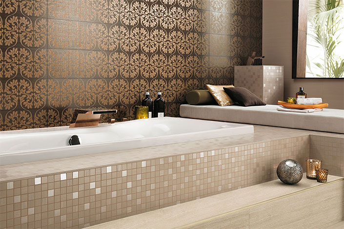 Обратите внимание на золотой Acanthe (Декор Atlas Concorde Brilliant Acanthe Gold), манящий своим роскошным блеском способен стать центром интерьера, создавая акцент на любой стене, превращая ее в шедевр. Этот декор будет прекрасно сочетаться с плиткой Brilliant Chocolat.