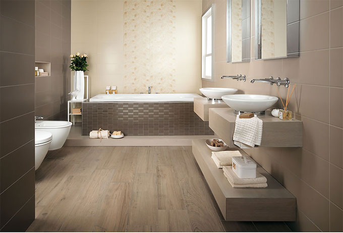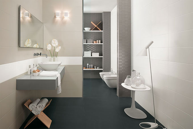 На пол рекомендуется любая плитка под дерево, например Atlas Concorde Etic, монотонная плитка под цемент или нейтральный камень (например, Ever Atlas Concorde или Evolve Atlas Concorde) или моноколоры (например, Atlas Concorde Chroma).