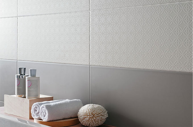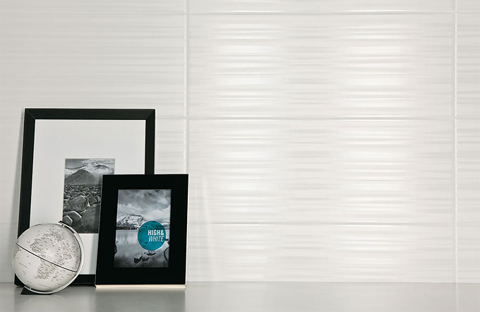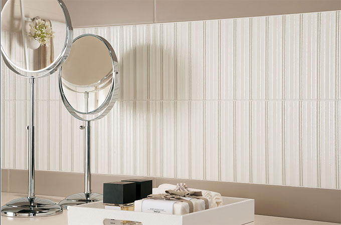 Плитка матовая, но можно использовать декор того же формата, на котором мягким отблеском отсвечивают полосы. Кроме того, в коллекции есть красивая мозаика формата 30,5х30,5 см и несколько вариантов декоров формата 20х50 см с рельефной поверхностью и бордюры формата 3х50 см.