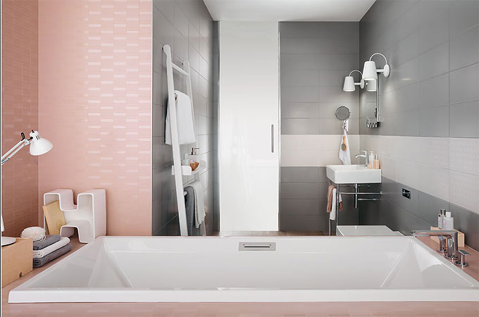 Помимо базовых цветов, в коллекции есть декор в виде полосок, который продается квадратными метрами и, благодаря удачной цене, может служить либо прекрасным фоном (если выложить им целиком стену), либо экономным декором (если пустить его полосой вдоль ванной комнаты).