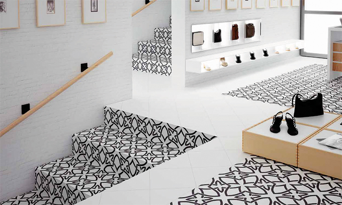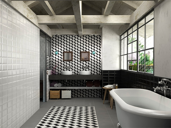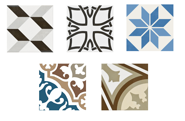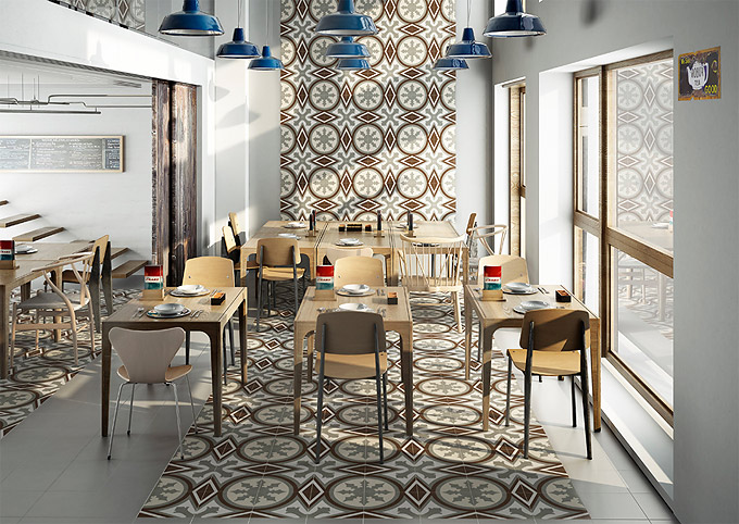 Основной акцент делается на пестрых рисунках, но вы можете дополнить рисунок нейтральными цветами - белый (Vanguard Blanco) и черный (Vanguard Negro). Формат дополнительной фоновой плитки тот же, что и у пола, и у стен - 29,75х29,75 см и 20х20 см соответственно.