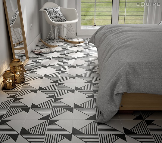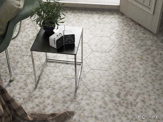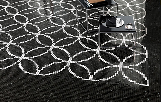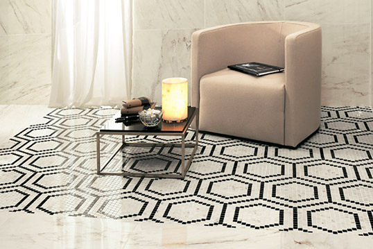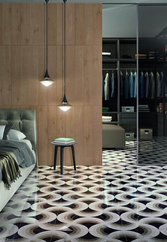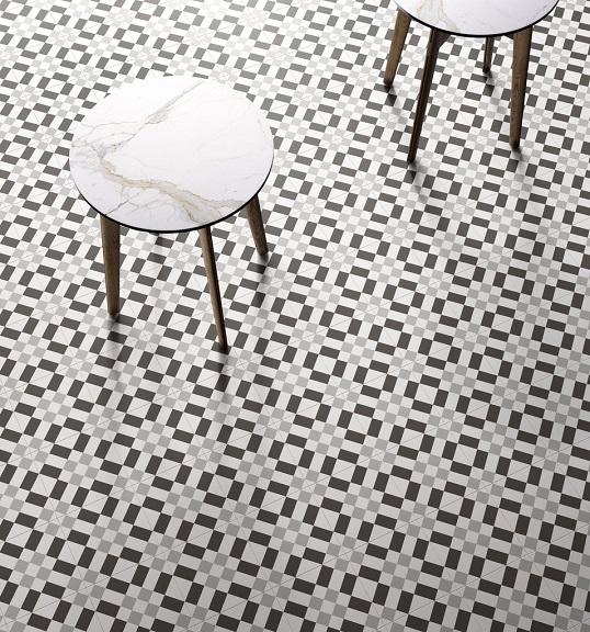 Керамогранит с двумя видами геометрического орнамента, сочетается с фоновой плиткой под камень. Производится в России на итальянском заводе группы Atlas Concorde.
