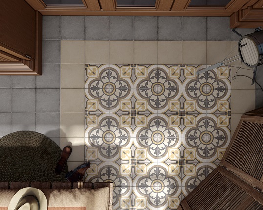 Напольная серия Pav.Colonial - настоящая находка для любителей натуральных материалов и оригинальных имитаций. Выполнена в стиле европейской классики, но с терпким восточным колоритом. На фото представлен еще один орнамент ORLEANS, выполненный в колониальном стиле. Составляемый из плитки 20х20 см орнамент имеет размер 40х40 см и может использоваться для оформления орнаментальных панно любого размера и конфигурации на полу. Отлично смотрится со светлой отделкой на стенах и яркими акцентами с экзотической растительностью, натуральной мебелью и элементами резьбы по ней.