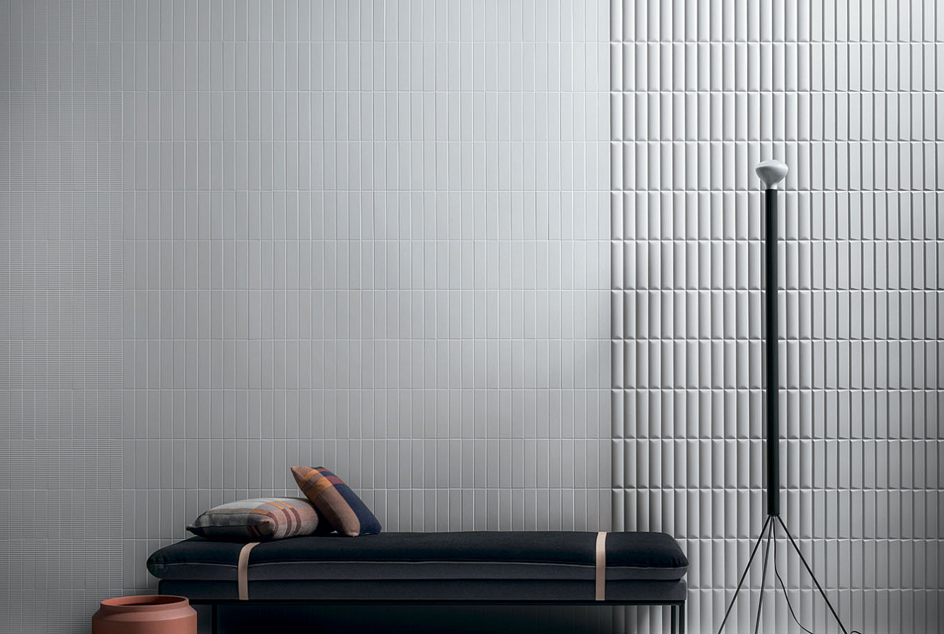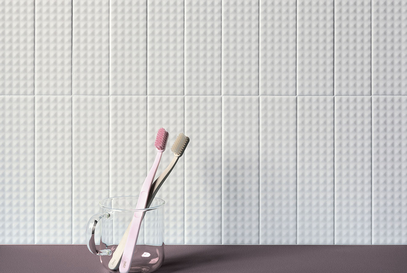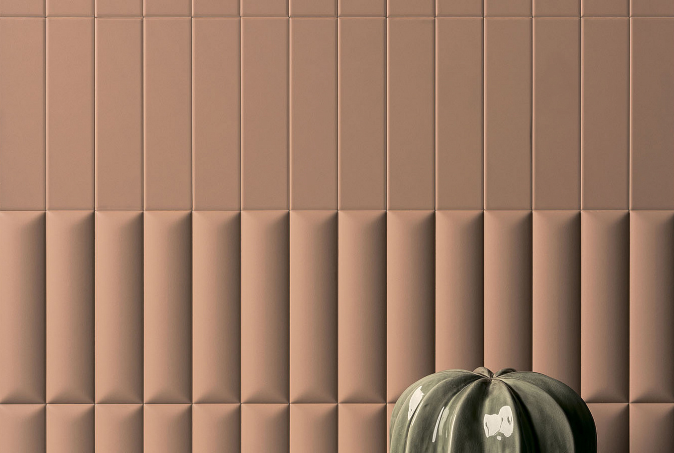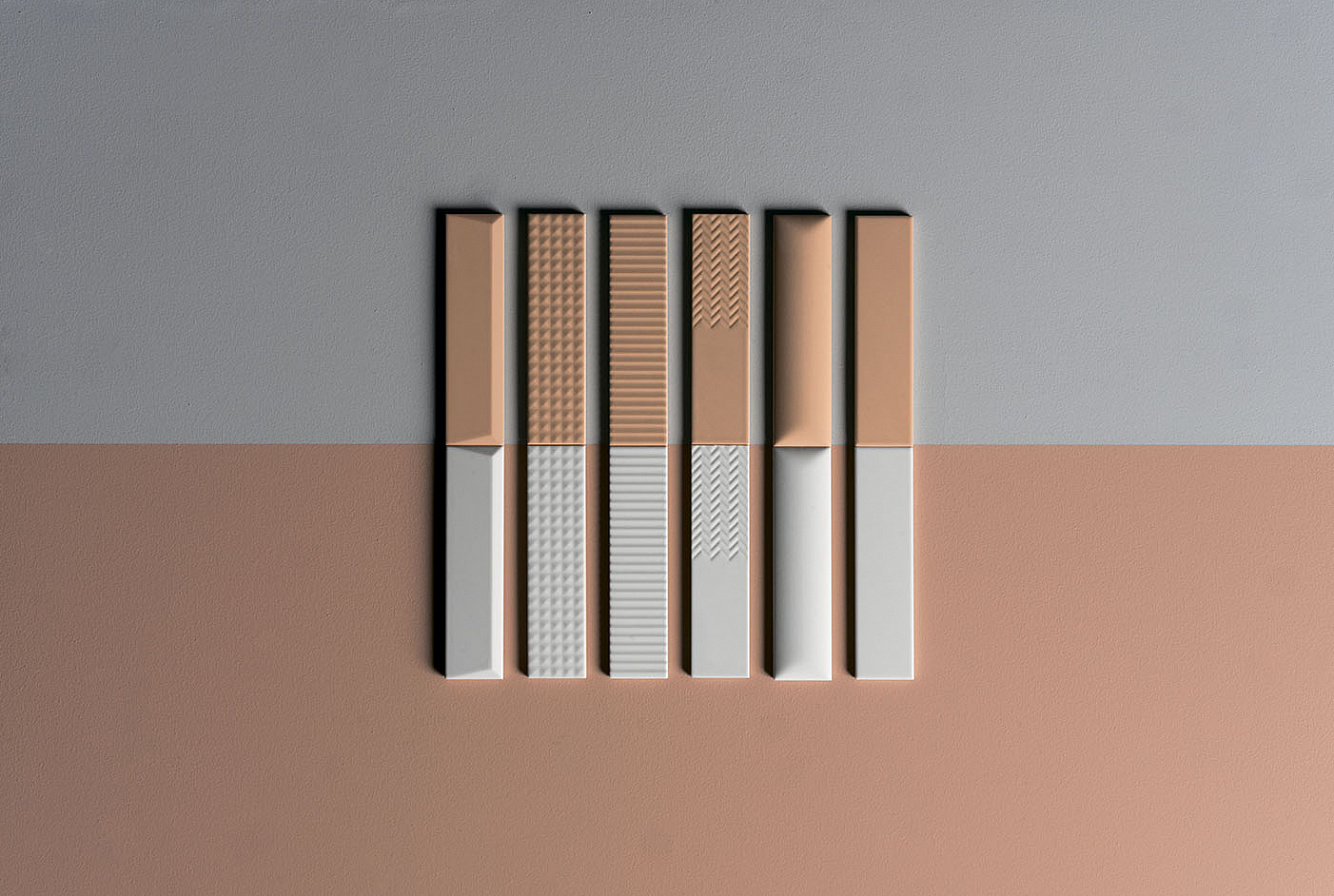 Второе, что привлекает внимание в Biscuit, это матовая поверхность и объемная текстура плитки. Каждая из цветовых линеек представлена плоской серией Plane, слегка выпуклыми элементами Dune и геометрическими паттернами Waves, Strip, Stud, Peak. При попадании лучей света на объемную текстуру плиток последних 4 линеек, стены дома будто оживают, позволяя наслаждаться удивительной игрой теней.