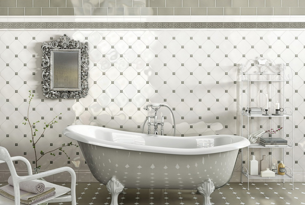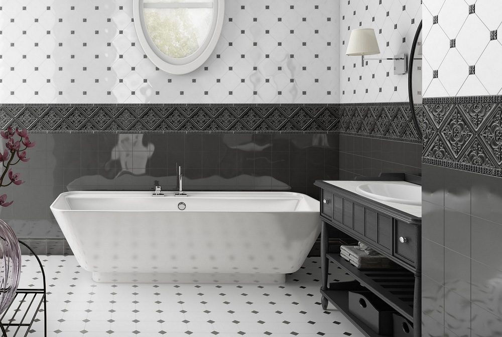 В коллекции предусматривается классическое сочетание белого черного цветов – черная плитка и белая таццетка. Такое сочетание часто используется и в интерьерах стиля арт-деко. Белая плитка и черная таццетка рекомендуются для интерьеров викторианской классики. Плитка рекомендуется для частного использования в домашних интерьерах и подходит для укладки в проходные помещения и влажные зоны. Кроме того, серая гамма впишется ив современные пространства.