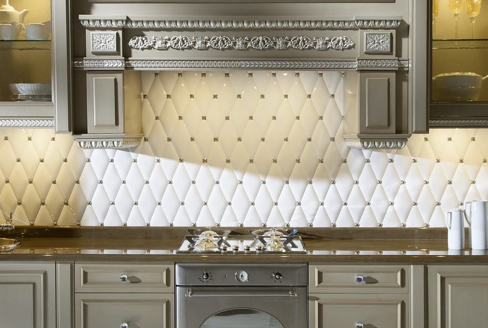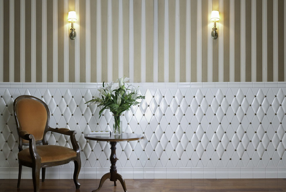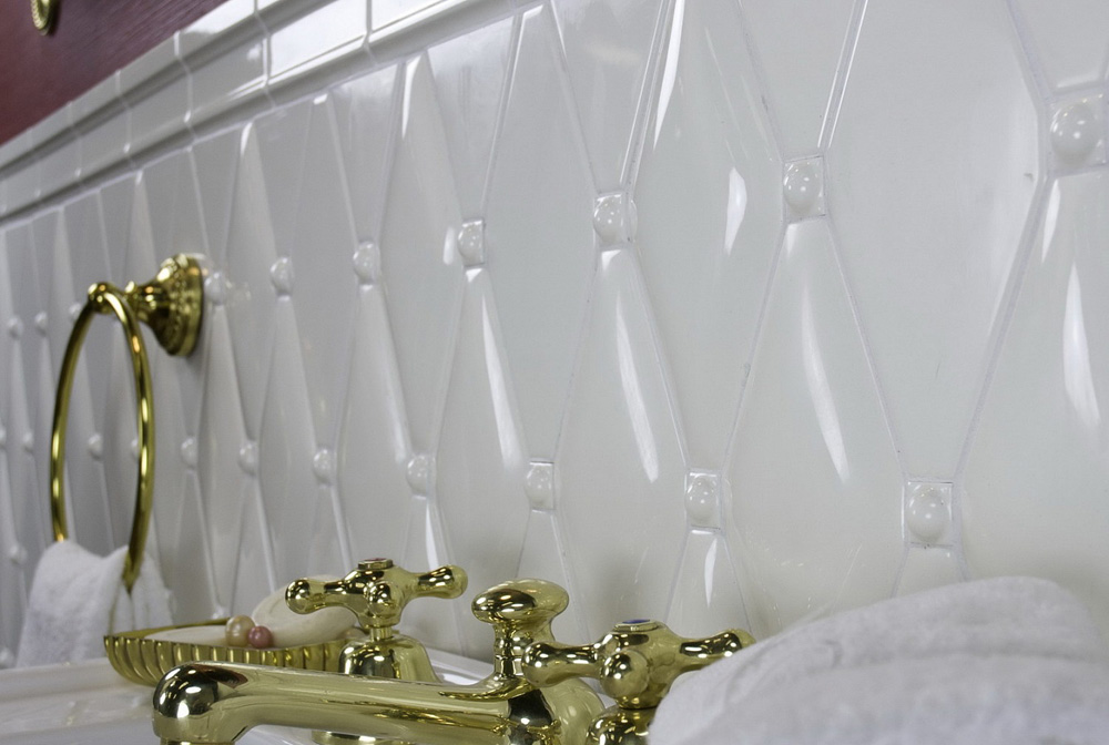 Таццетки для плитки выпускаются с гладкой и круглой выпуклой форме гвоздиков в восьми цветах. Дизайнеры Adex предусмотрели вариативности дизайнерских решений для создания роскошных интерьеров представительского вида. Плитка Rombos подойдет для организации пространства в стиле арт-деко, классика и модерн. Серия под бархат Micro в белом цвете Nacar особенно торжественно презентабельно смотрится с золотыми таццетками Oro.