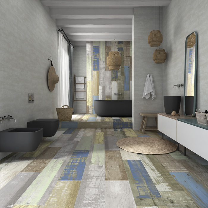 Цветовая палитра Chalkwood от Aparici понравится, как любителям теплых, так и холодных цветов: бело-серая White, бежево-коричневая Brown, бирюзово-оливковый Vestige. Дополнительно предусмотрена микс-мозаика на сетке Chalkwood Nat.Mosaico 29,75х29,75 см, состоящая из кубиков размером 5х5 см различного цвета. Фабрика предусмотрела возможность заказа плинтусов Chalkwood Rodapie 7,3х99,55 см.