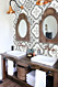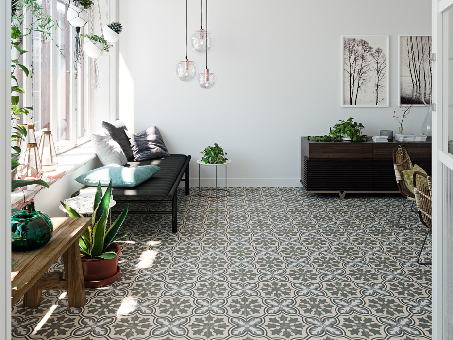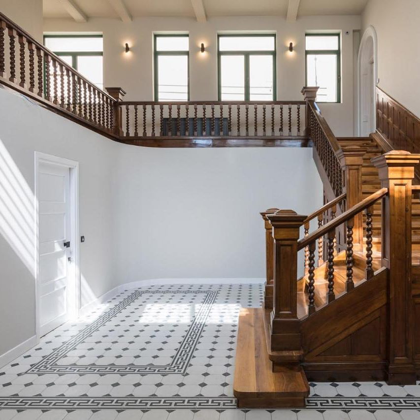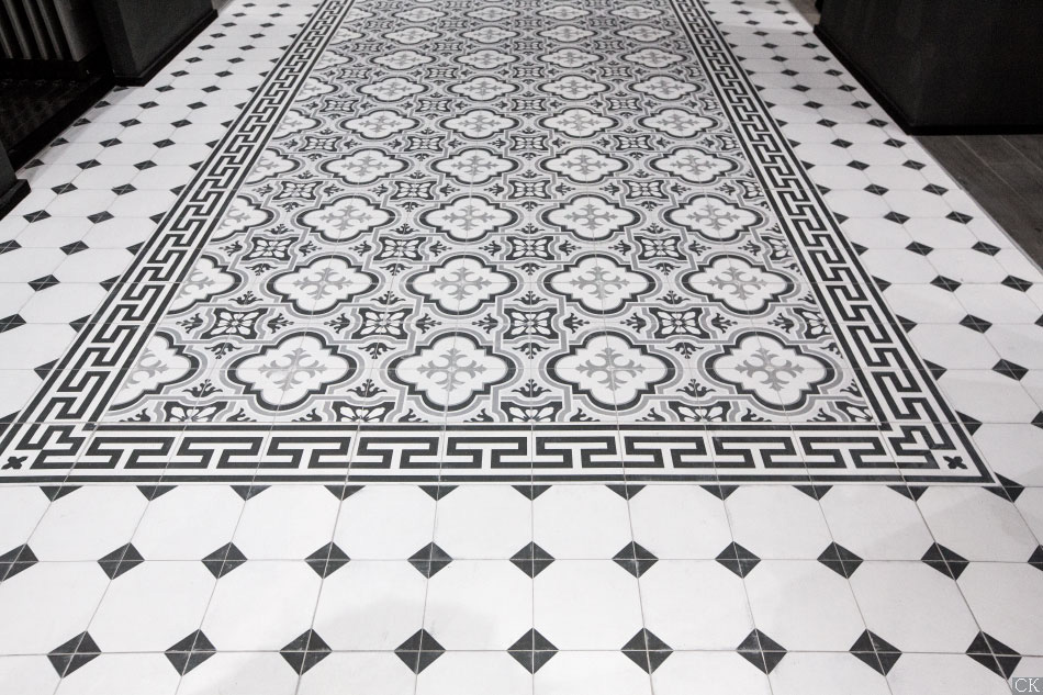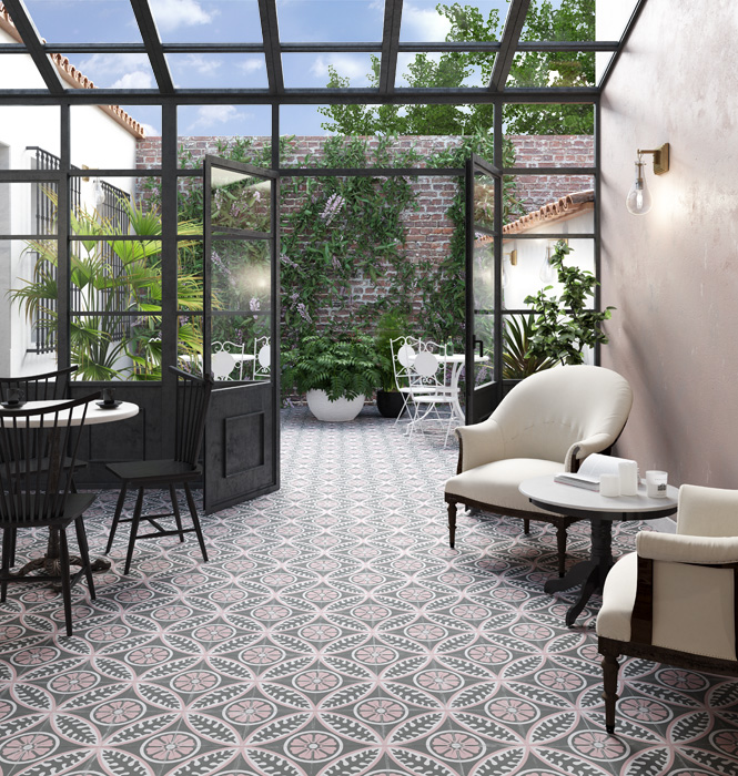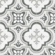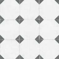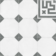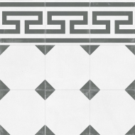 Это имитация классической викторианской укладки белой плитки с черными таццетками и бордюрами с рисунком греческого меандра - Crespo. Яркие аргентинские и испанские паттерны в виде замкнутых орнаментов (Gaona, Telmo, Boedo, Pampa, Almirante). Плитка покрыта матовой глазурью и имеет достаточный коэффициент антискольжения (R10), достаточный для безопасной укладки даже во влажных и проходных зонах домашнего интерьера. Возможность заказа ступеней – дополнительный бонус для гармоничного поддержания единого стиля во всем помещении, в том числе на лестнице.