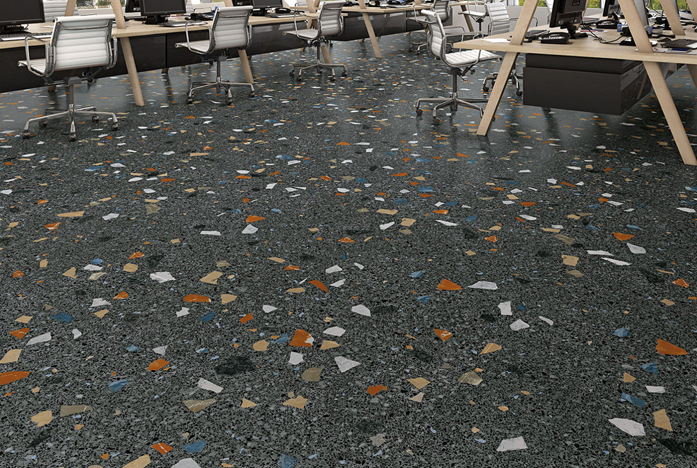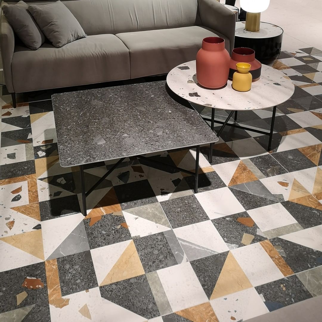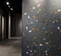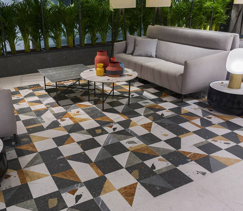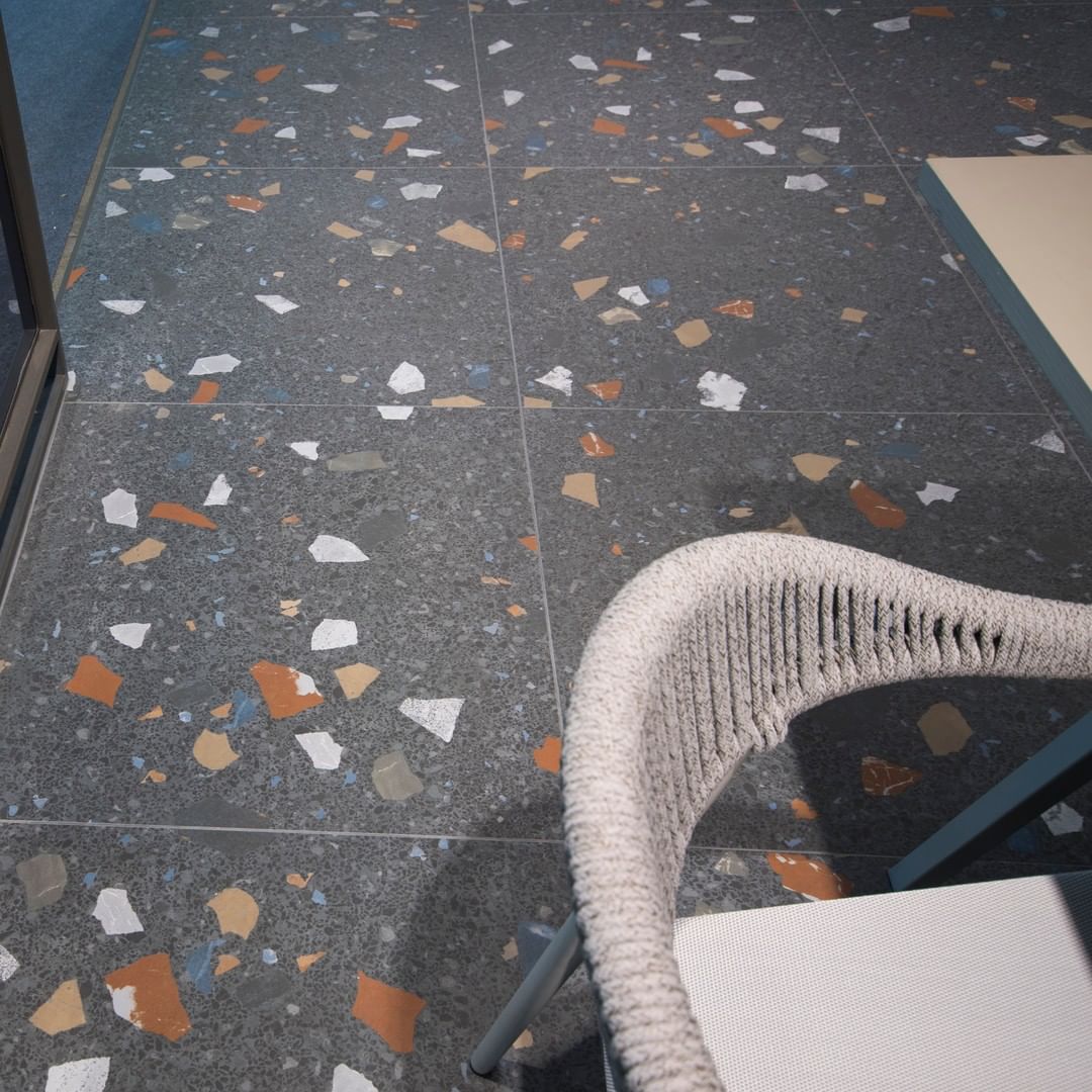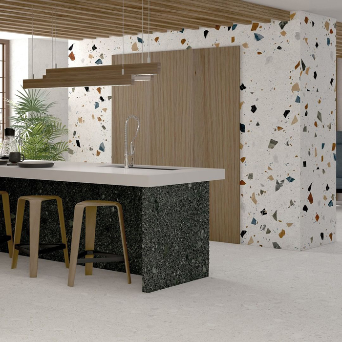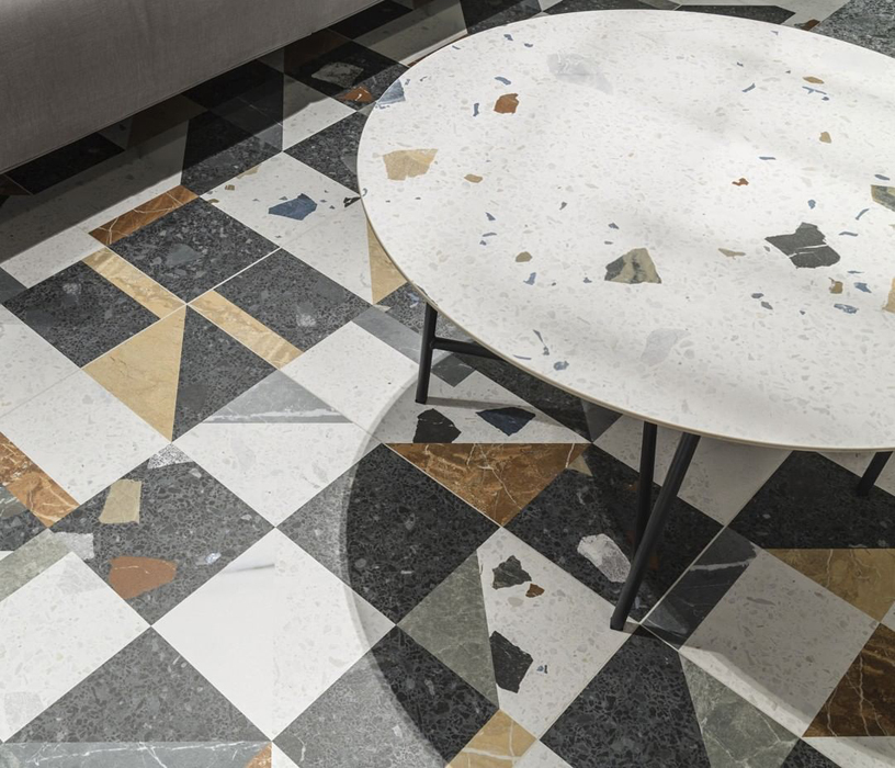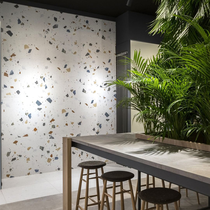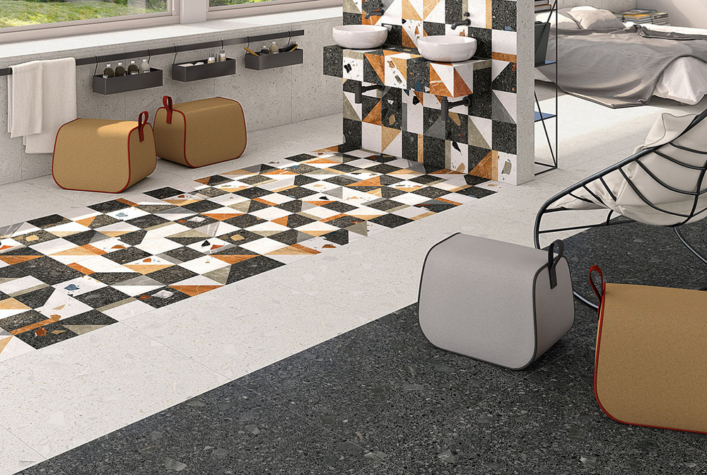 Концептуально коллекция состоит из трех различных видов терраццо-плитки. Базовые элементы представлены однотонными Miscela Nacar и Miscela Grafito. Светлая плитка Miscela Nacar визуально напоминает мозаику из зерен различного размера. Более насыщенной в этом плане выглядит Miscela Grafito, состоящая из контрастирующих между собой черных и светлых зерен. Максимально оригинально выглядят элементы Stracciatella-r: на фоне мелкозернистой однотонной структуры выделяются яркие ассиметричные вкрапления более крупных геометрических элементов.