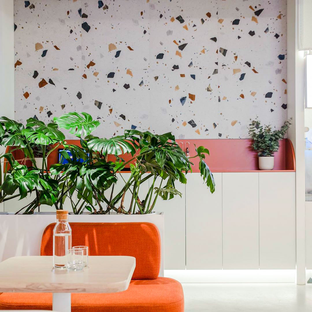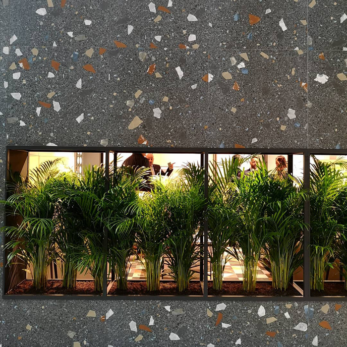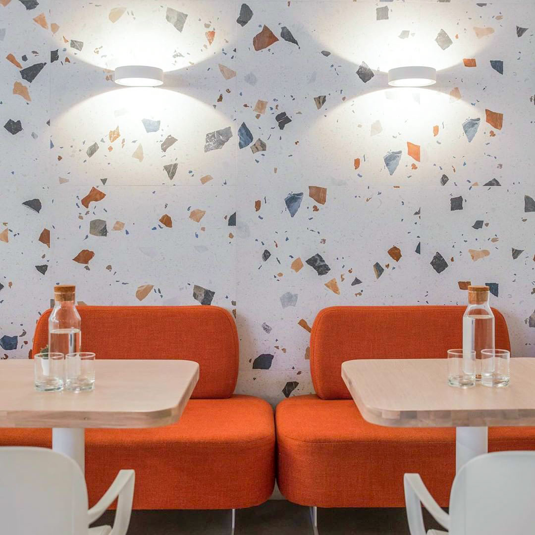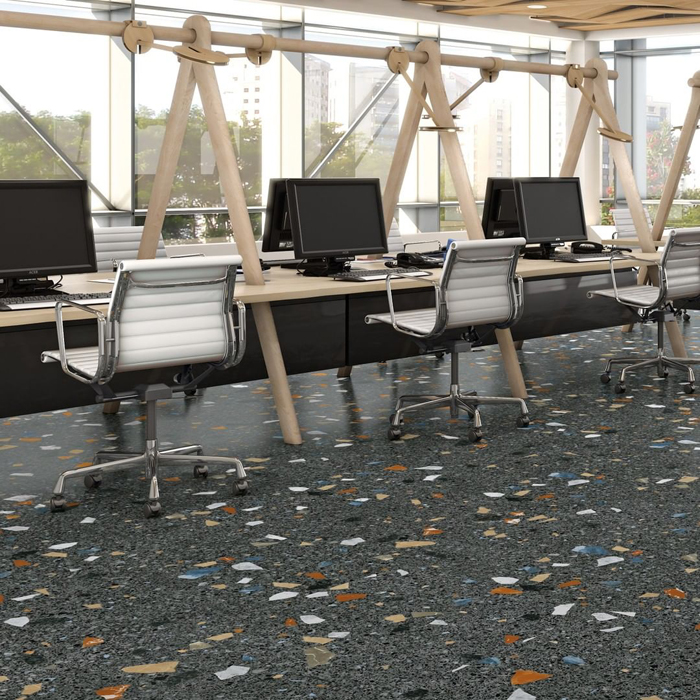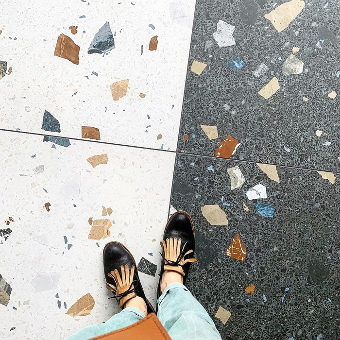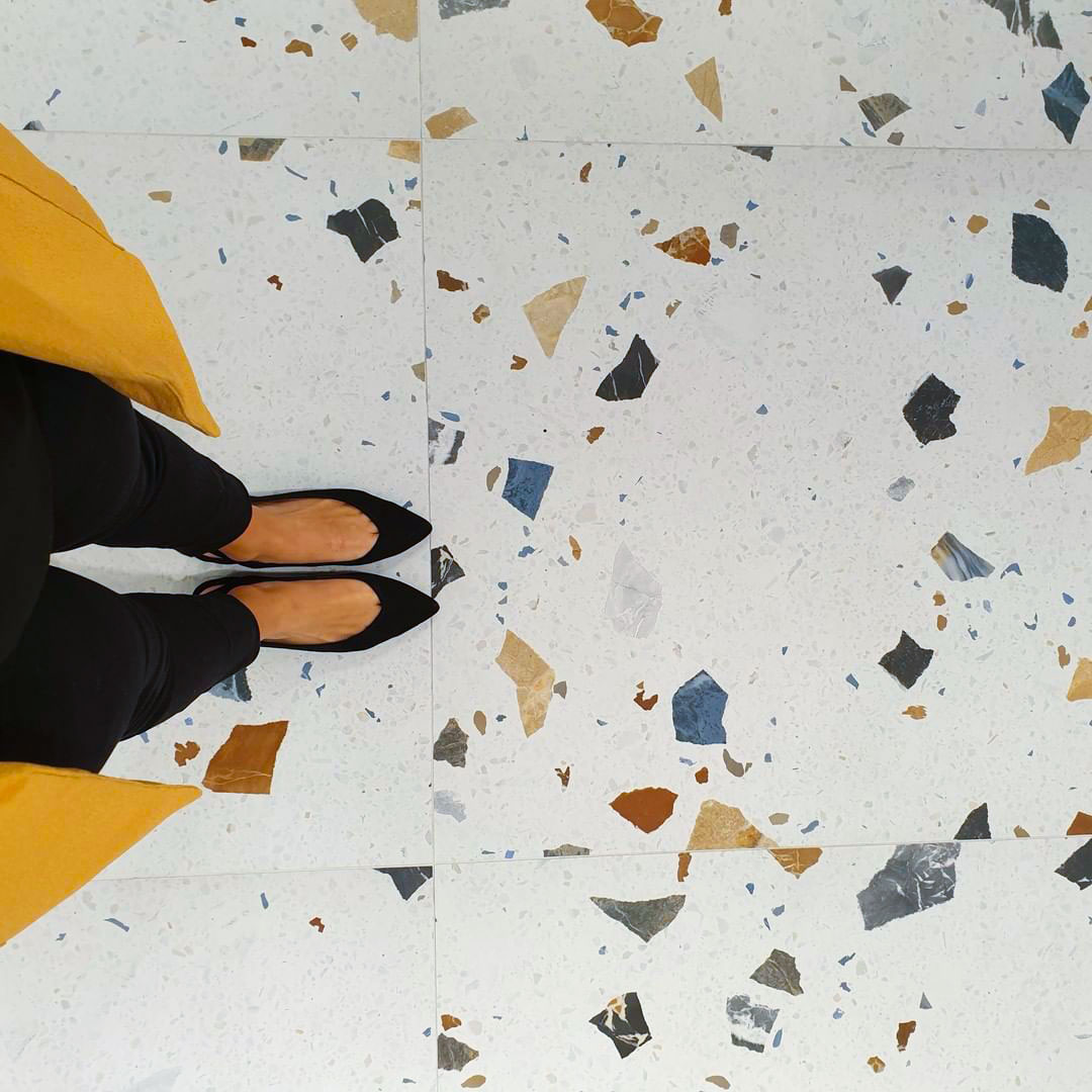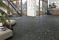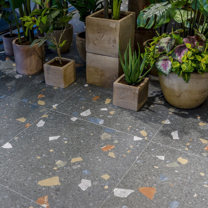 Концептуально коллекция состоит из трех различных видов терраццо-плитки. Базовые элементы представлены однотонными Miscela Nacar и Miscela Grafito. Светлая плитка Miscela Nacar визуально напоминает мозаику из зерен различного размера. Более насыщенной в этом плане выглядит Miscela Grafito, состоящая из контрастирующих между собой черных и светлых зерен. Максимально оригинально выглядят элементы Stracciatella-r: на фоне мелкозернистой однотонной структуры выделяются яркие ассиметричные вкрапления более крупных геометрических элементов.