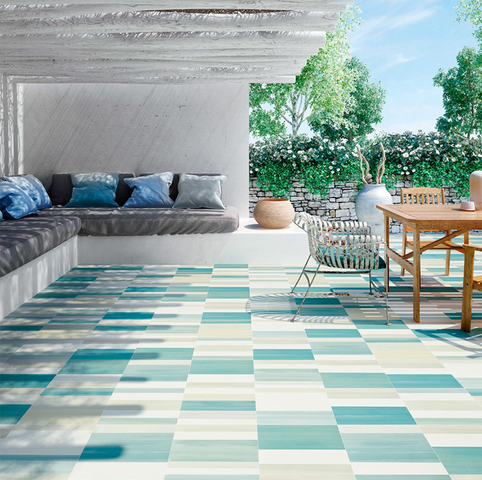 В коллекции керамогранита Cabana испанская фабрика Aparici выпускает и однотонную плитку Cabana White 29,75х29,75 см. Дополнительно предлагается мозаика Cabana Nat. Mosaico 29,75х29,75 см с размером чипа 5х5 см во всех вариативных цветах фоновой плитки в виде цветового микса из различных оттенков (White, Emerald, Sapphire, Topaz). Чтобы полностью оформить интерьер предусмотрены плинтуса Cabana White Natural Rodapié 7,3х29,75 см и накладные ступени с насечками Cabana Nat. Peld. 29,75х29,75 см.