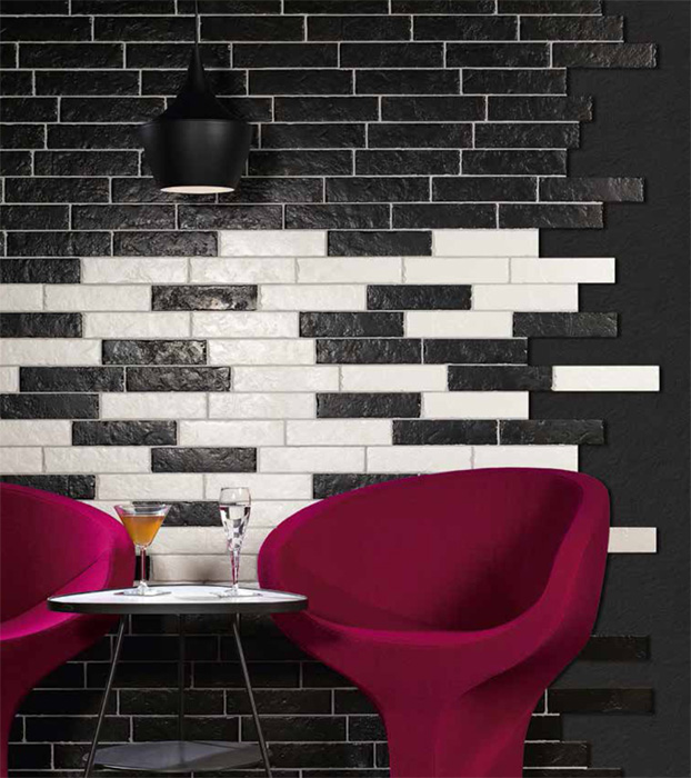 Модули удобны при облицовке всей стены в «кирпичном» стиле для смелого, необычного интерьера творческих натур. При оформлении отдельных зон логично использовать плитку меньшего размера 6.5х25 см. При этом возможны различные альтернативы классической облицовке со смещением, например, «ёлочка» или «вьетнамка», характерные для паркетной укладки на полу. Для акцентирования внимания на отдельных фрагментах кирпичной кладки в коллекции предусмотрены декоративные элементы в виде отдельных драгоценных кирпичиков размером 6.5х25 см, покрытых серебряной, золотой или бронзовой краской: серебро Plata,бронза Cobre, золото Oro.