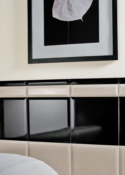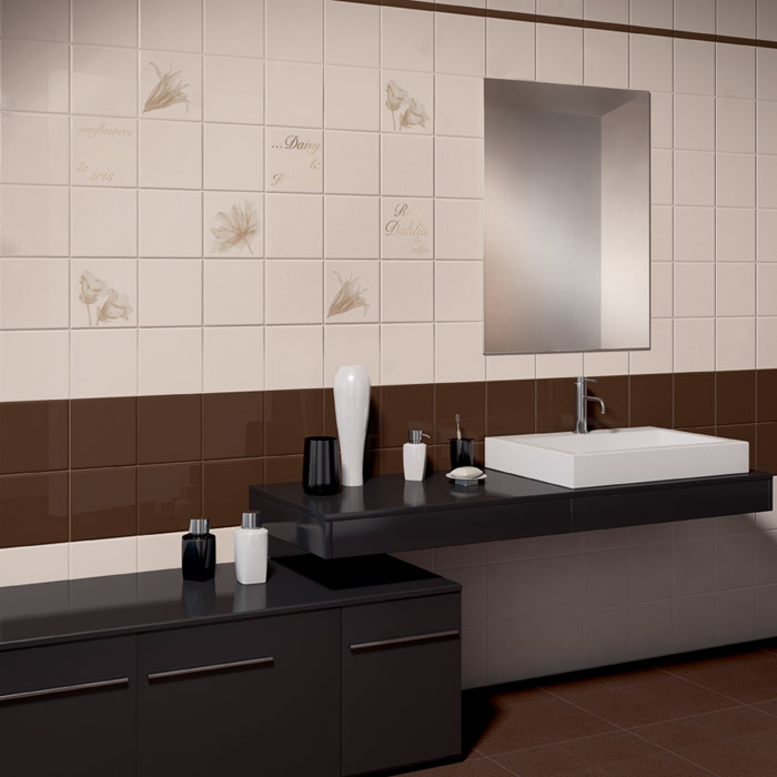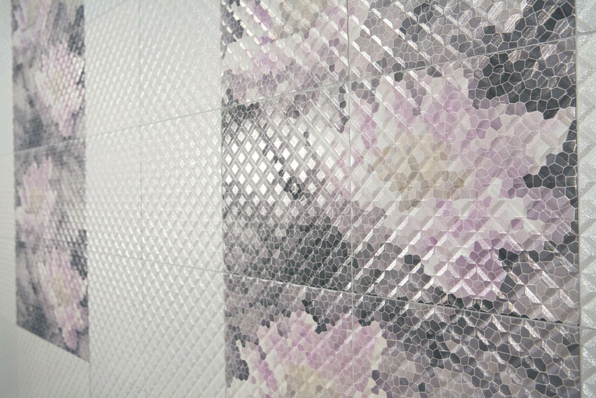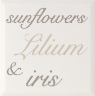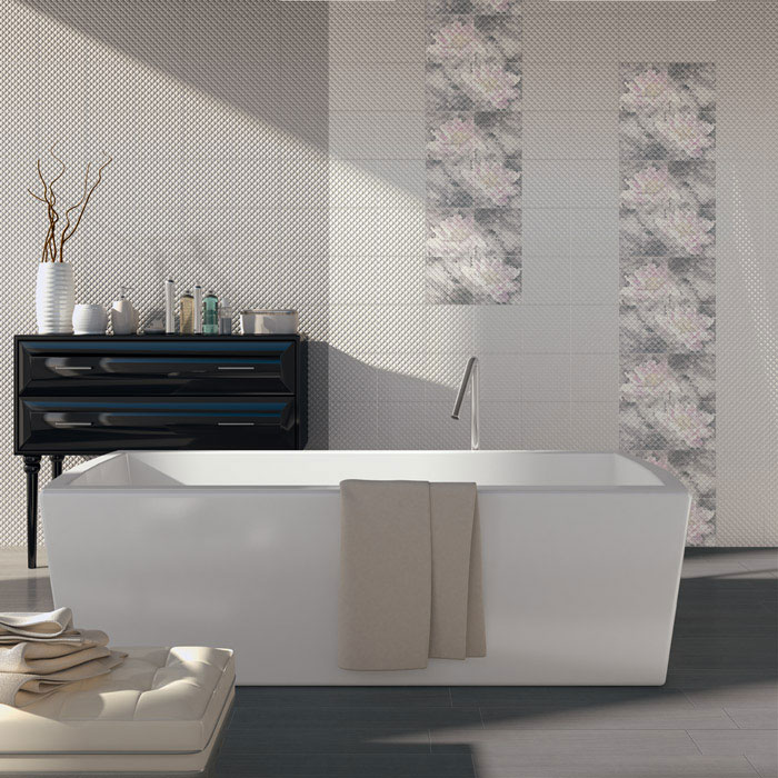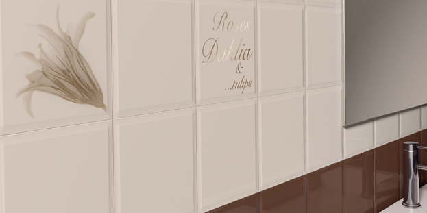 В дымчатом и жемчужном цветах созданы еще несколько примечательных декоров и бордюров. На декор (20х20 см) и бордюр (5х20 см) «Надписи» изящным шрифтом нанесены слова Daisy, Harebell, Roses, Fris, Dahlia & tulips. Бордюр для этого декора выпускается во всех цветах коллекции. Названия модных столиц мира нашли свое место на декоре (20х20 см) и бордюре (5х20 см) серии «Путешествие». Полупрозрачные, монохромные силуэты нежных лилий легли на декор «Цветок» (20х20 см).