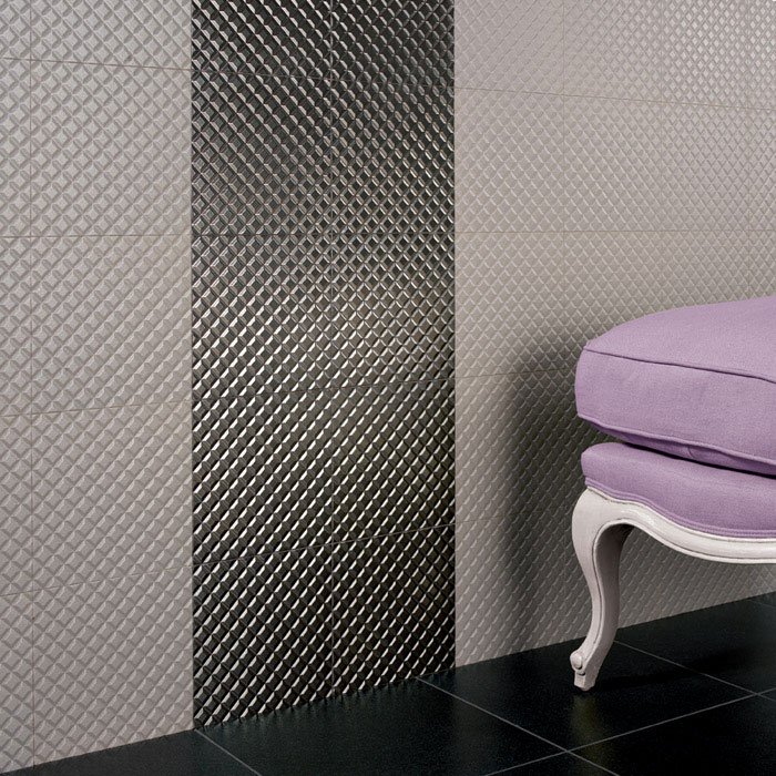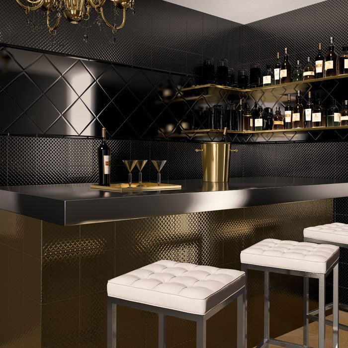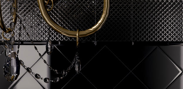 В основе коллекции Etoile ABK цвета, которые уже несколько сезонов подряд находятся на пике модных тенденций: дымчатый, пудра, жемчуг, какао, красный, мокко, черный. Основные элементы линии Etoile ABK выпускаются в трех вариантах, в размере 20х20 см. Каждый из цветов коллекции представлен в виде одноцветной глянцевой плитки и в виде элемента «Ромбы», напоминающего трехмерную мозаику из миниатюрных ромбов. Для дымчатого и жемчужного цветов предлагается плитка «Ромбы Люкс». Ее поверхность имеет покрытие diamond lux, имитирующее переливы драгоценного металла. Декоры «Ромбы» продолжают тему драгоценностей и выполнены в «золоте» и «платине». В этих же цветах выдержаны бордюры «Аллюр» (2,5х20 см).
