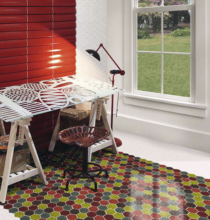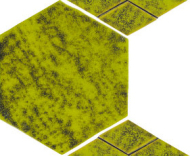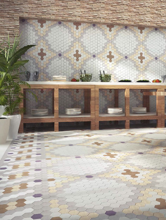 Для построения симметричных футуристичных орнаментов в коллекции Panal фабрики Natucer предусмотрены специальные элементы во всех цветовых решениях с глянцевой поверхностью: