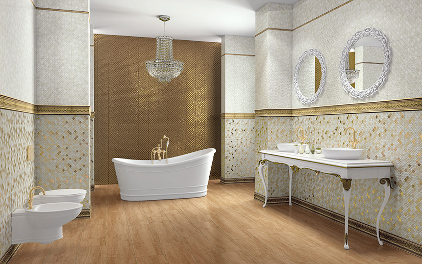 Для каждого декоративного элемента предлагаются уголки для аккуратного оформления стыка на углах и коробах Gold и Copper: для карнизов Ishtar Ang. Mold. 1.5х3 см, для бордюров Ishtar Ang. Cf. 2х11 см, для цоколей. Благодаря использования PVD-технологии покрытие отличается высокой стойкостью к истиранию и появлению царапин, чем при традиционном способе нанесения драгоценных металлов на поверхность плитки.