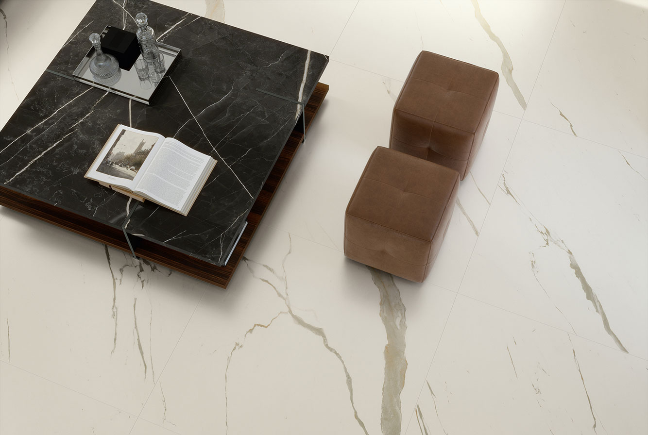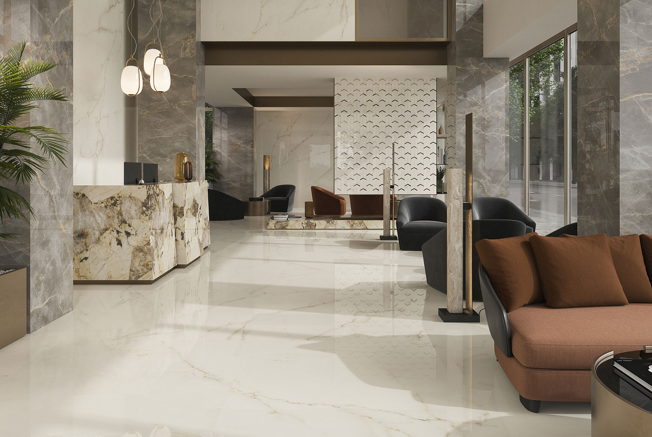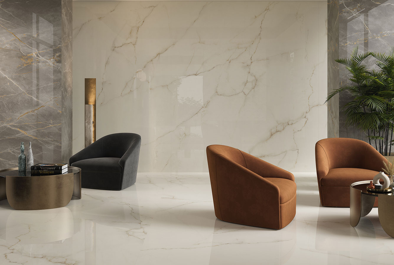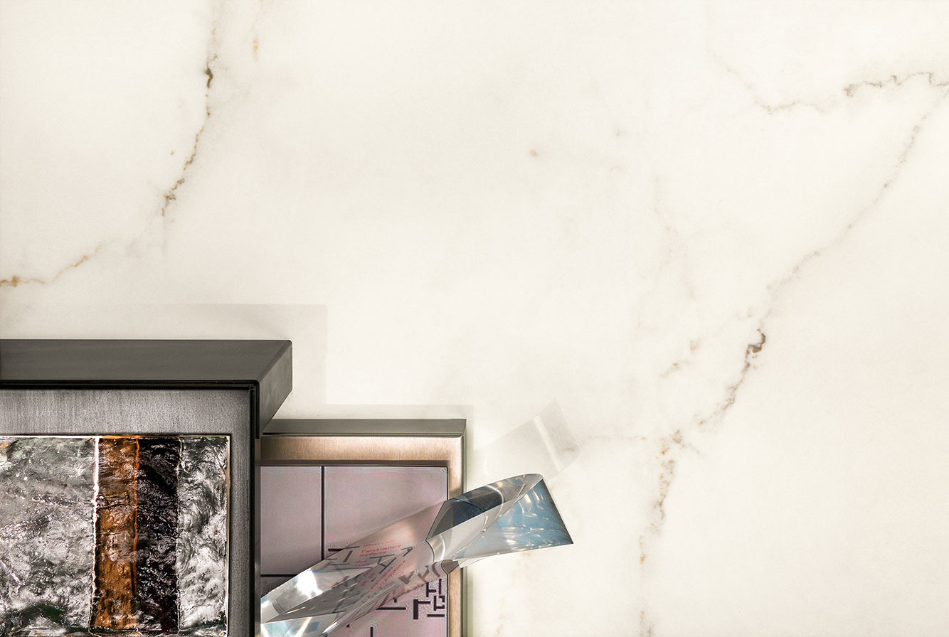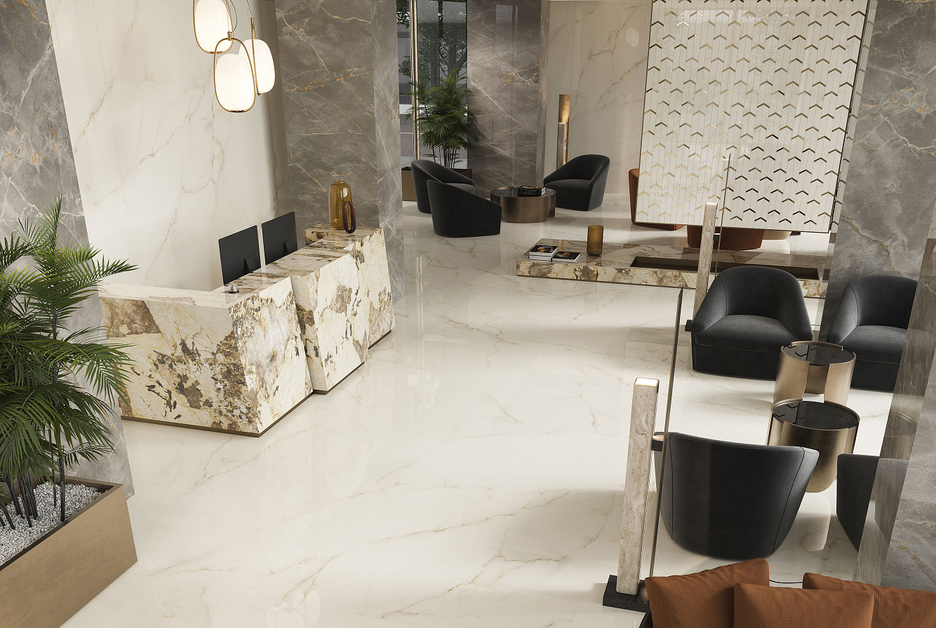 Имитация мрамора Calacatta Michelangelo с теплым фоном и золотистыми прожилками. Лаппатированная обработка подчеркивает глубину прожилок, а поверхности Matt и Silk создают мягкие, плавные переходы. -