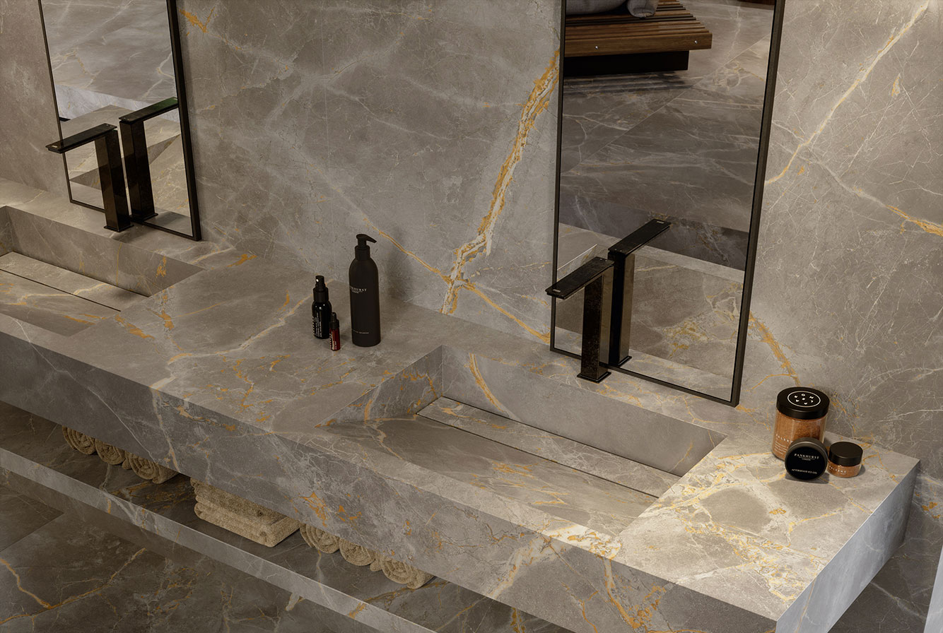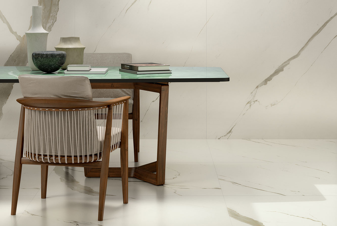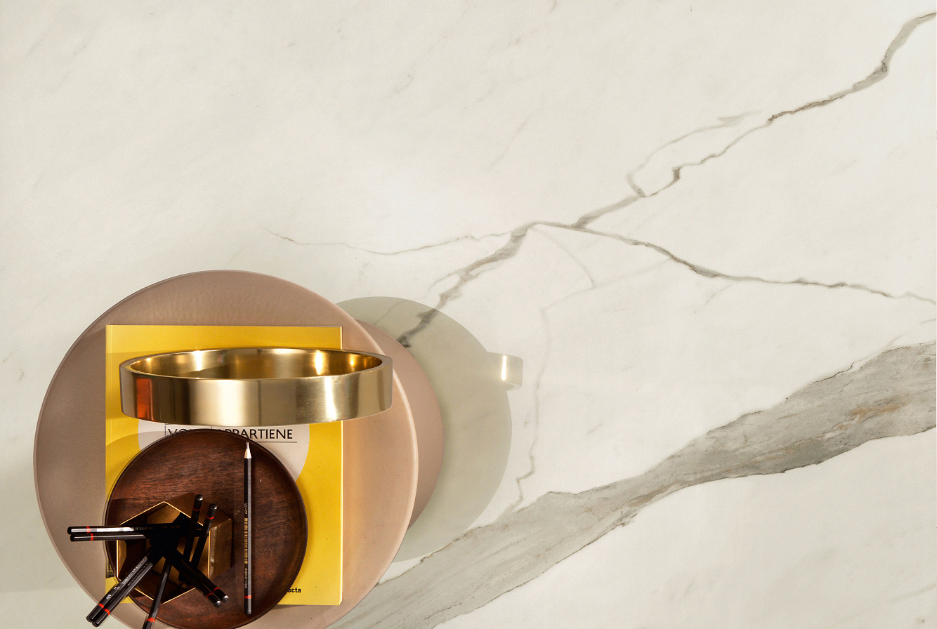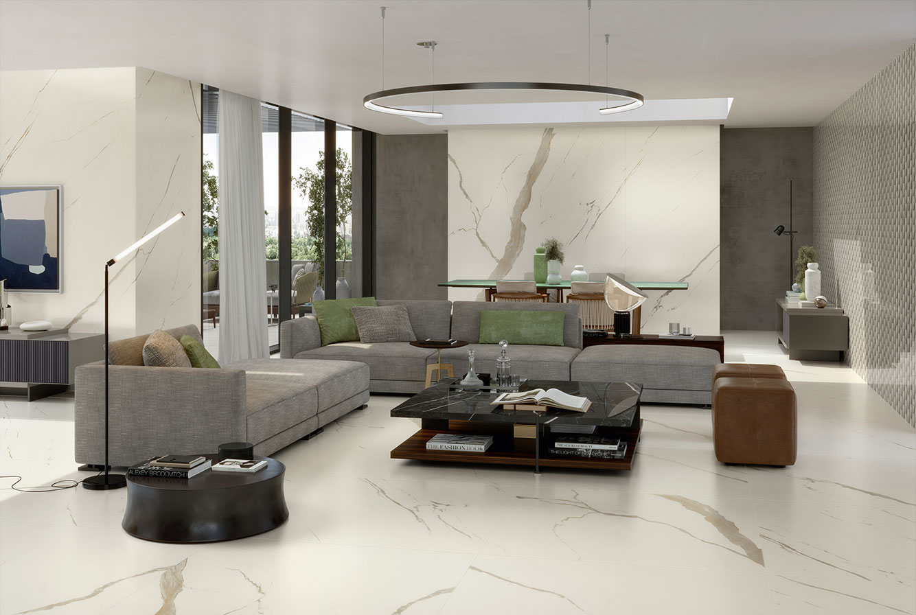Имитация мрамора Calacatta Michelangelo с теплым фоном и золотистыми прожилками. Лаппатированная обработка подчеркивает глубину прожилок, а поверхности Matt и Silk создают мягкие, плавные переходы. -