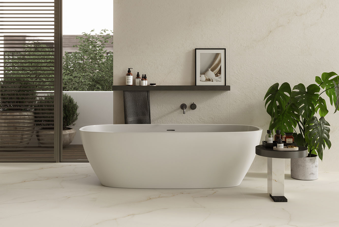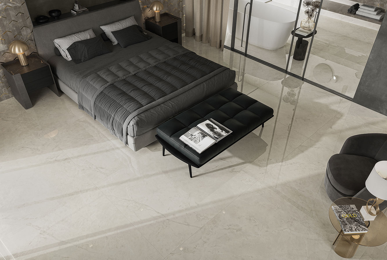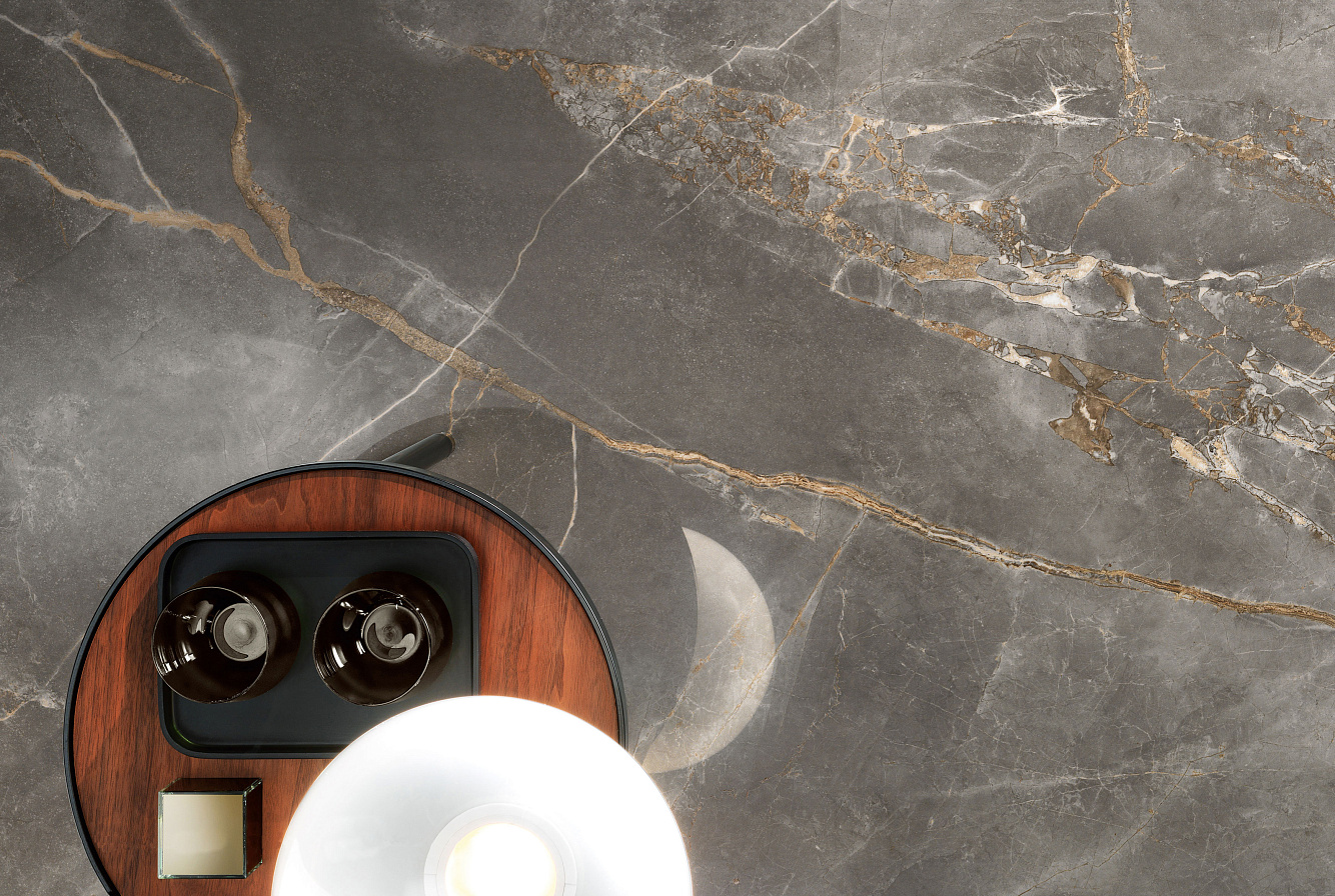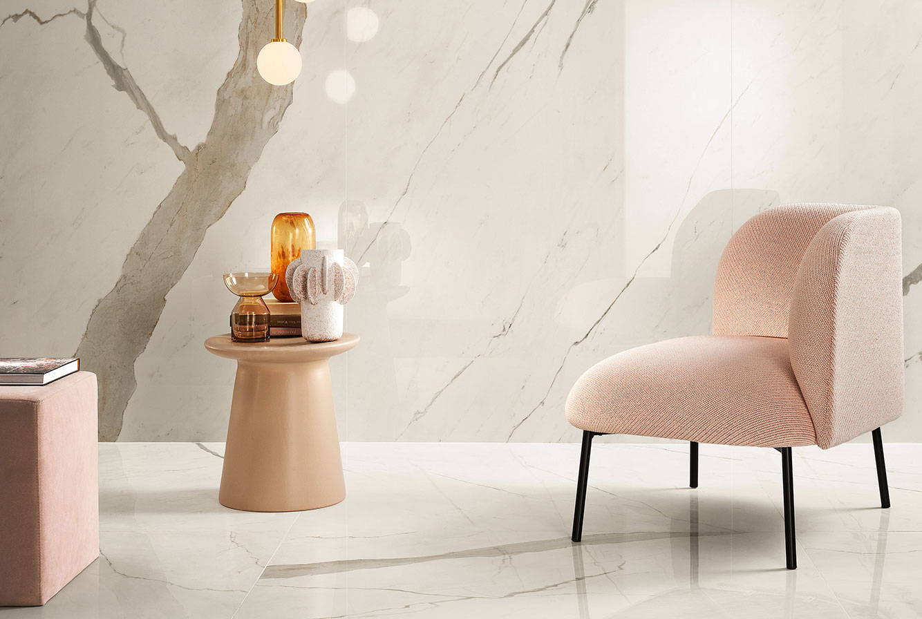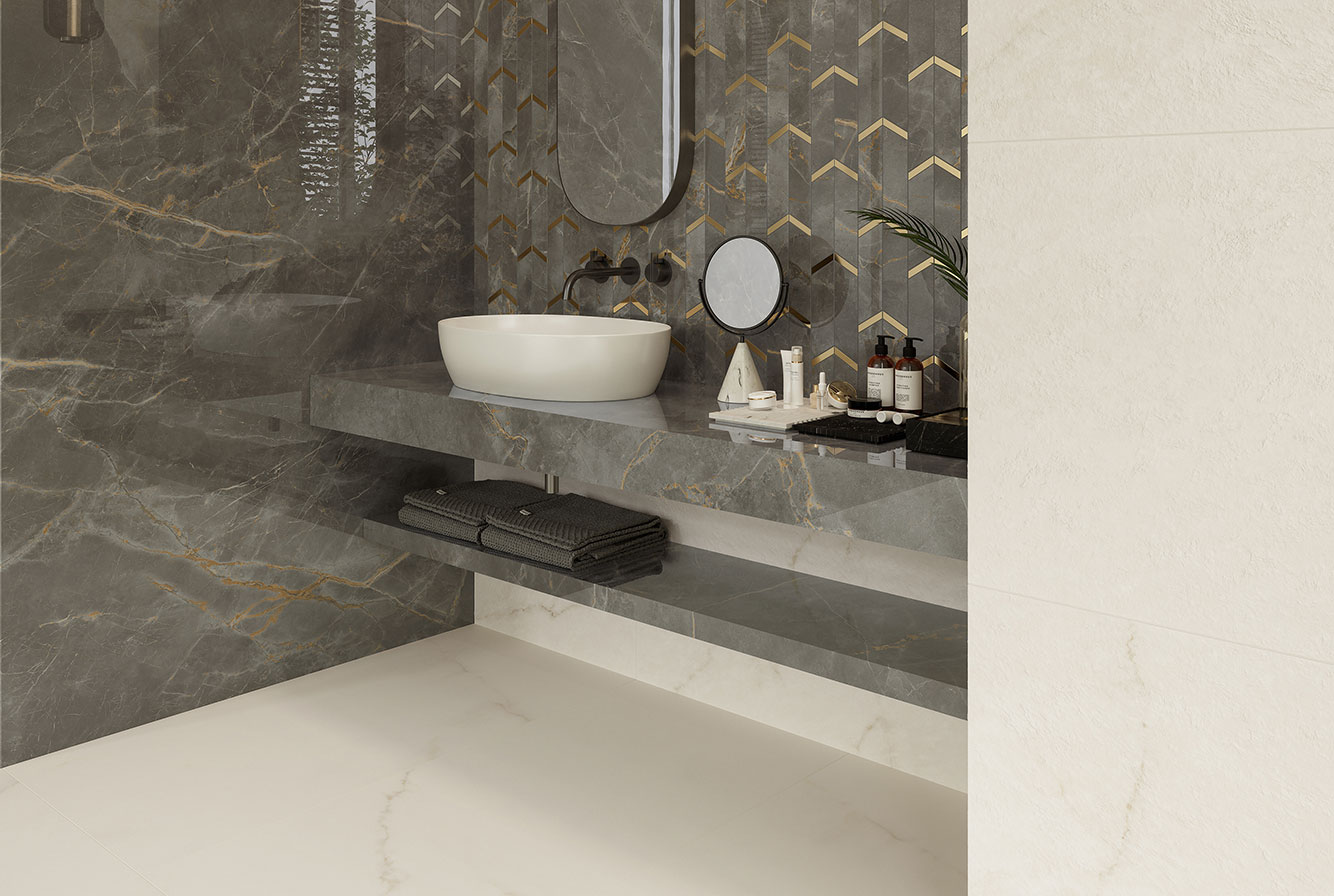 Имитация мрамора Calacatta Michelangelo с теплым фоном и золотистыми прожилками. Лаппатированная обработка подчеркивает глубину прожилок, а поверхности Matt и Silk создают мягкие, плавные переходы. -