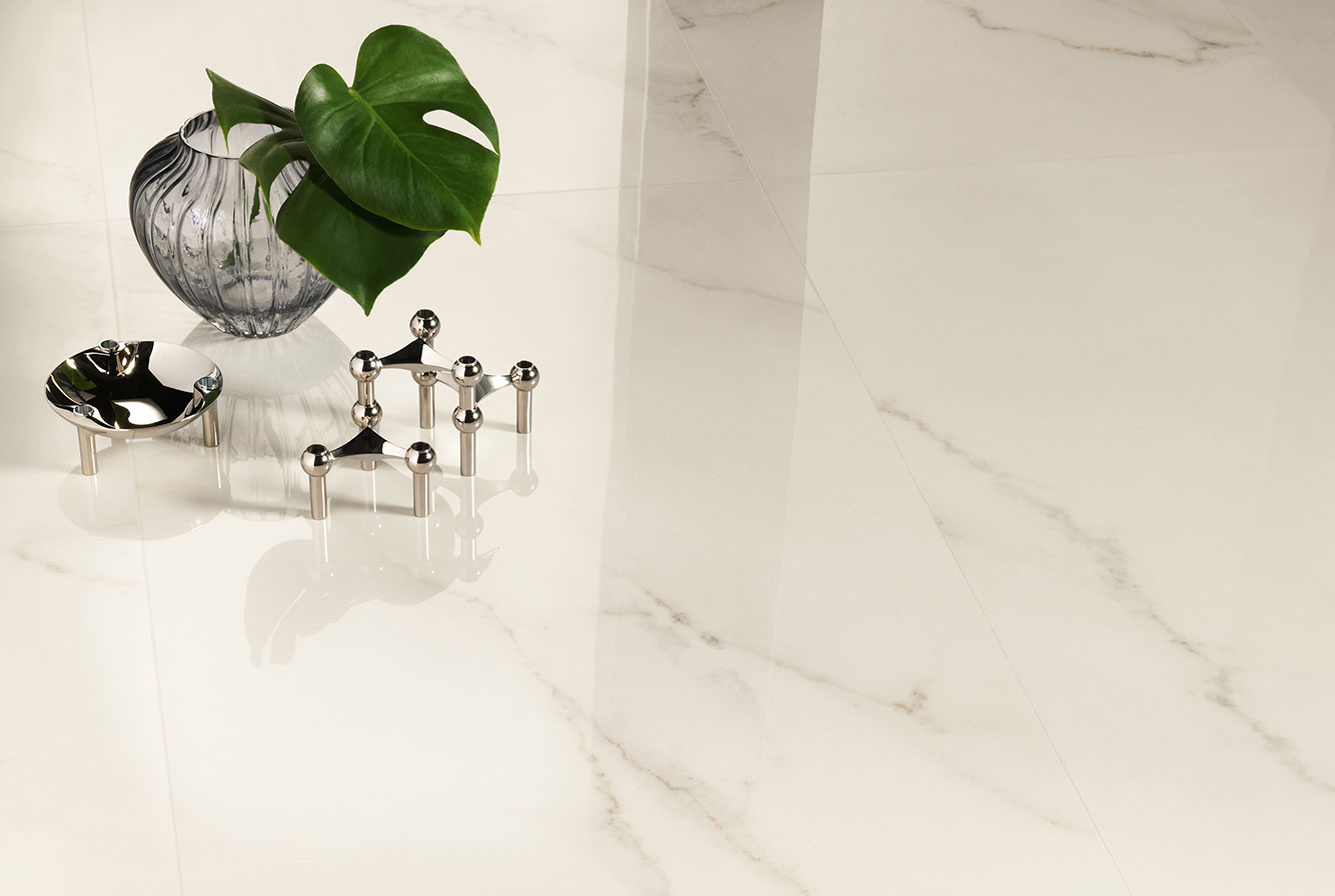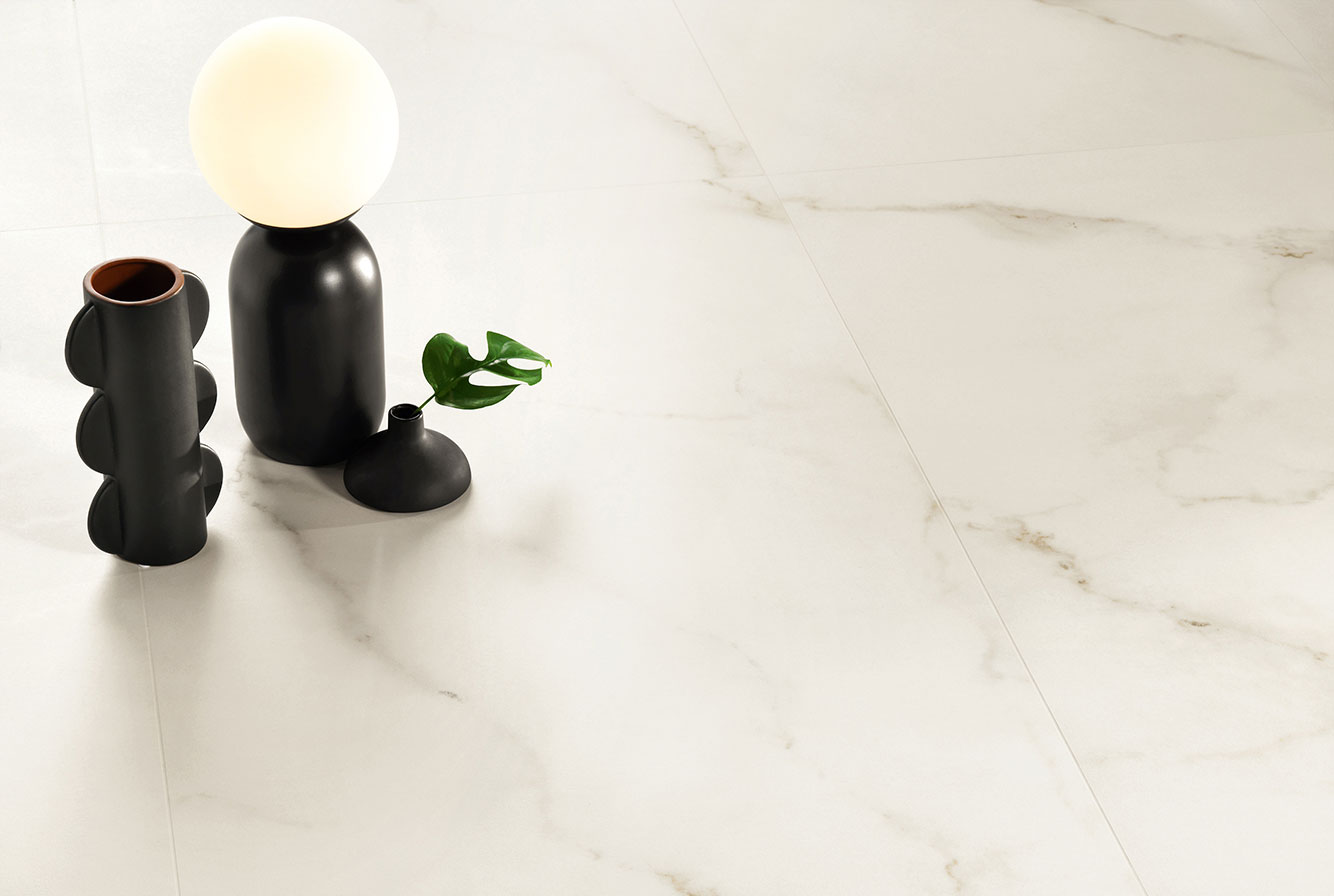 Воссоздает ценные плиты мрамора Calacatta с чистым белым фоном, дополненным теплыми пятнами и прожилками. Идеальный выбор для создания изысканных интерьеров. -