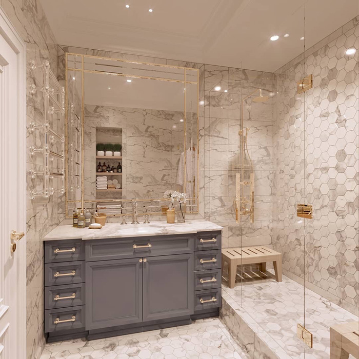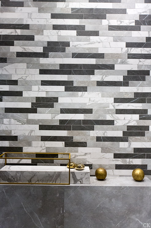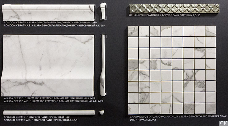 Особенностью мозаики является ее не только эстетическая сторона и практичность, удобство укладки на сложных поверхностях с радиусом (арки, колонны), покатых ступеней в ванной, наклонных поверхностей в душевых. В серии драгоценного мрамора Charme Evo Italon тщательным образом продуманы даже мельчайшие детали, к которым относятся дополнительные специальные элементы классического направления: