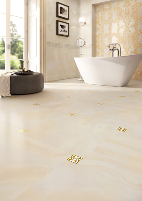 Керамогранит Charme Evo Onix имитирует редкую породу иранского мрамора солнечного оттенка.