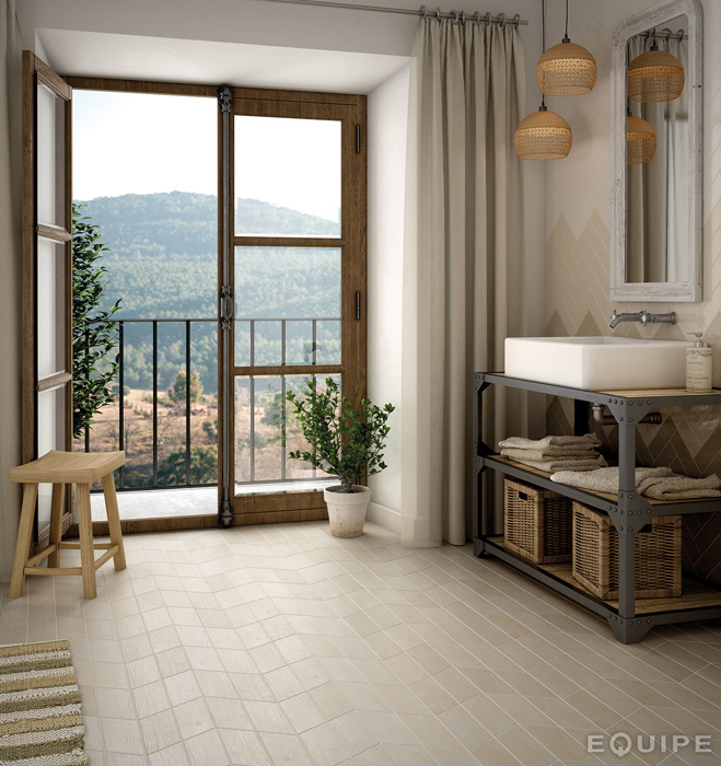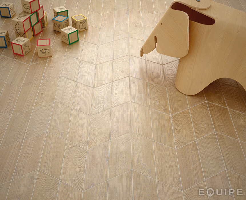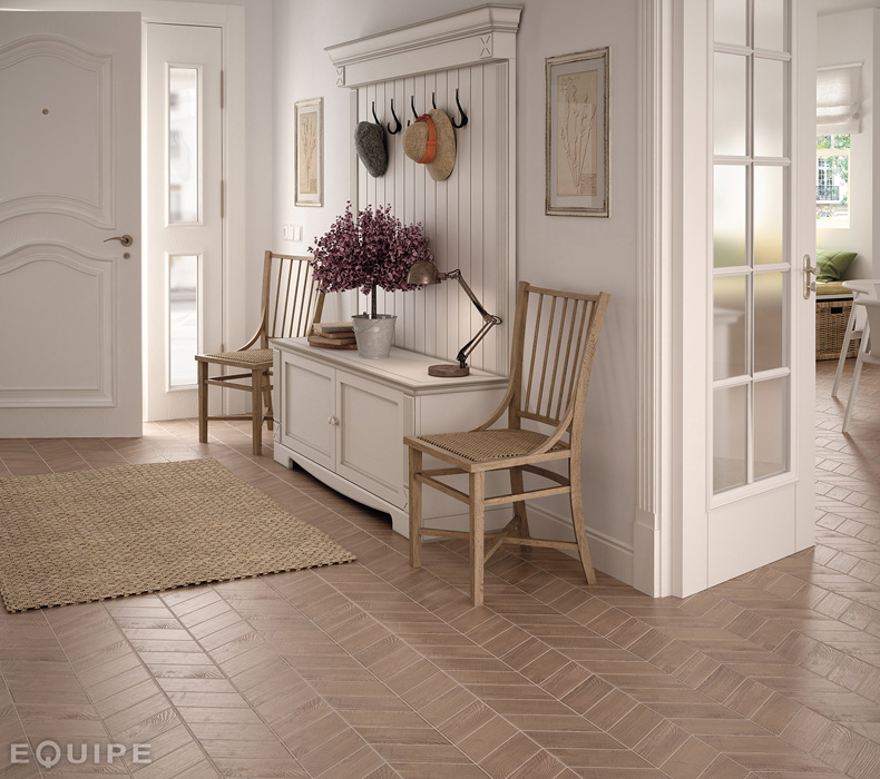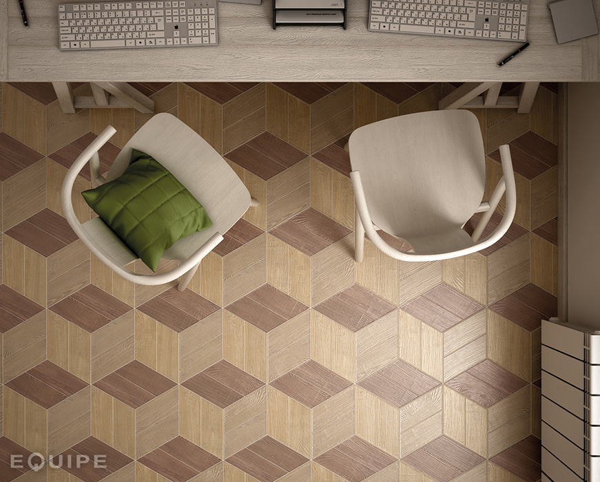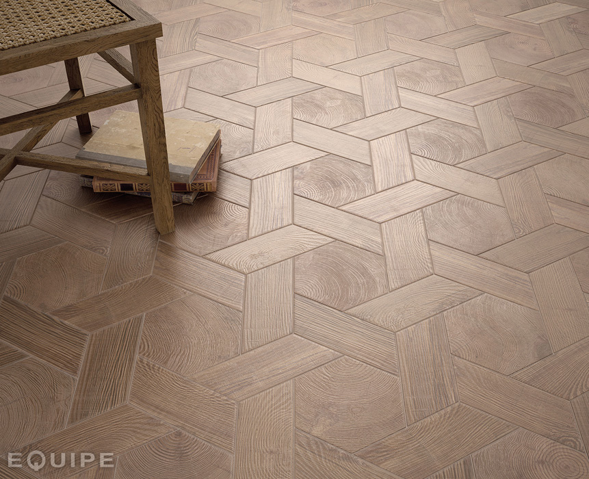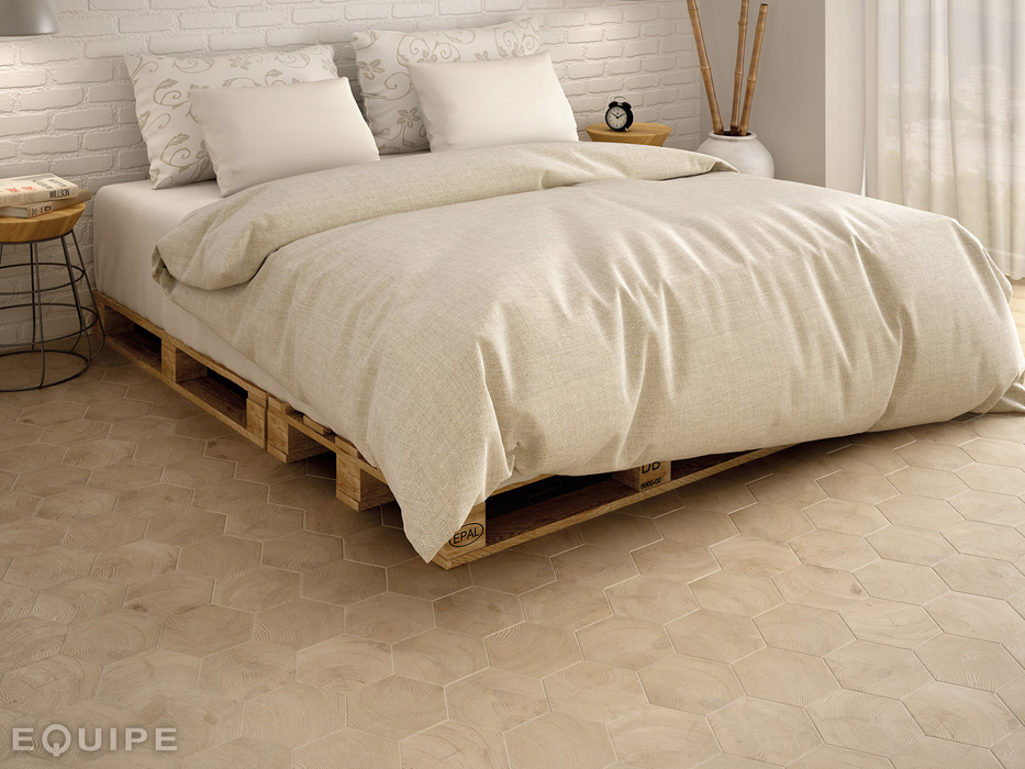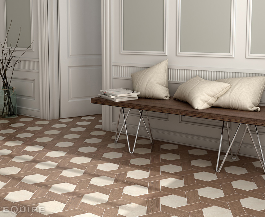 Коллекция керамической плитки Equipe Hexawood – настоящий эксклюзив в ассортименте испанской фабрики Equipe. Ни одна фабрика не может похвастаться наличием в своем ассортименте шестиугольной плитки с текстурой натурального дерева с рисунком поперечного распила. Испанские дизайнеры смогли объединить в одном формате и текстуру древесины, и форму шестигранника, и формата «шеврон» в виде паркетных плашек со скошенным краем.