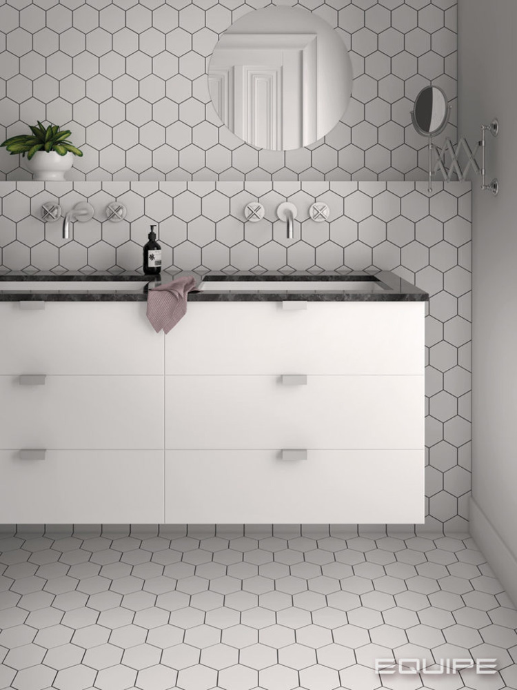 Откройте для себя коллекцию Equipe Kromatika — универсальный керамогранит в форме миниатюрных шестиугольных сот размером 11,6x10,1 см. Эта серия идеально подходит для создания изысканных интерьеров, где каждая деталь имеет значение.