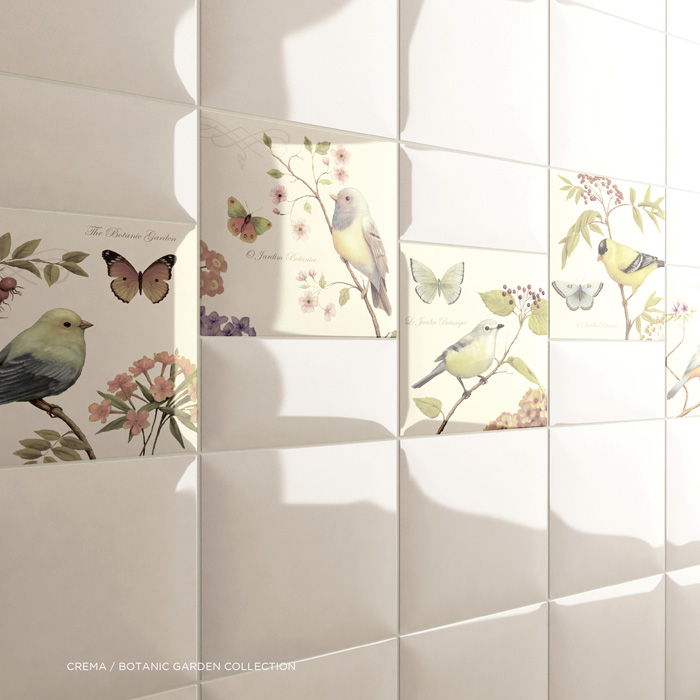 Эксклюзивные декоративные элементы стиля французского замка Луары: серия Amadis Fine Tiles Botanic Garden Collection в формате 15х15 см. Красочно оформленные зарисовки редких видов птиц, растений и бабочек в акварельной имитации.