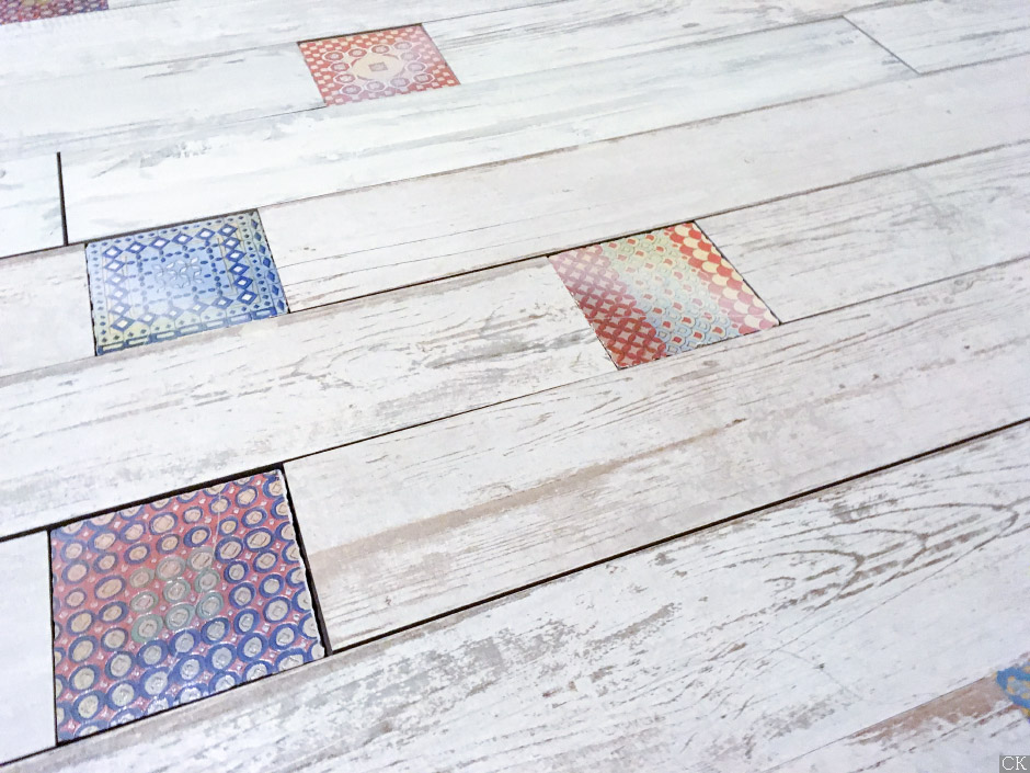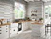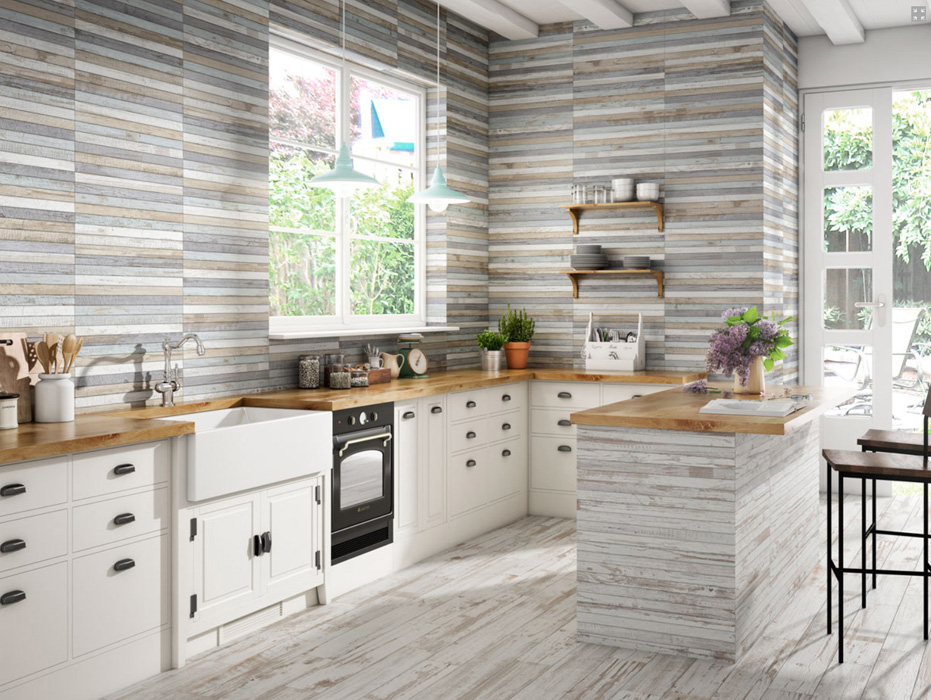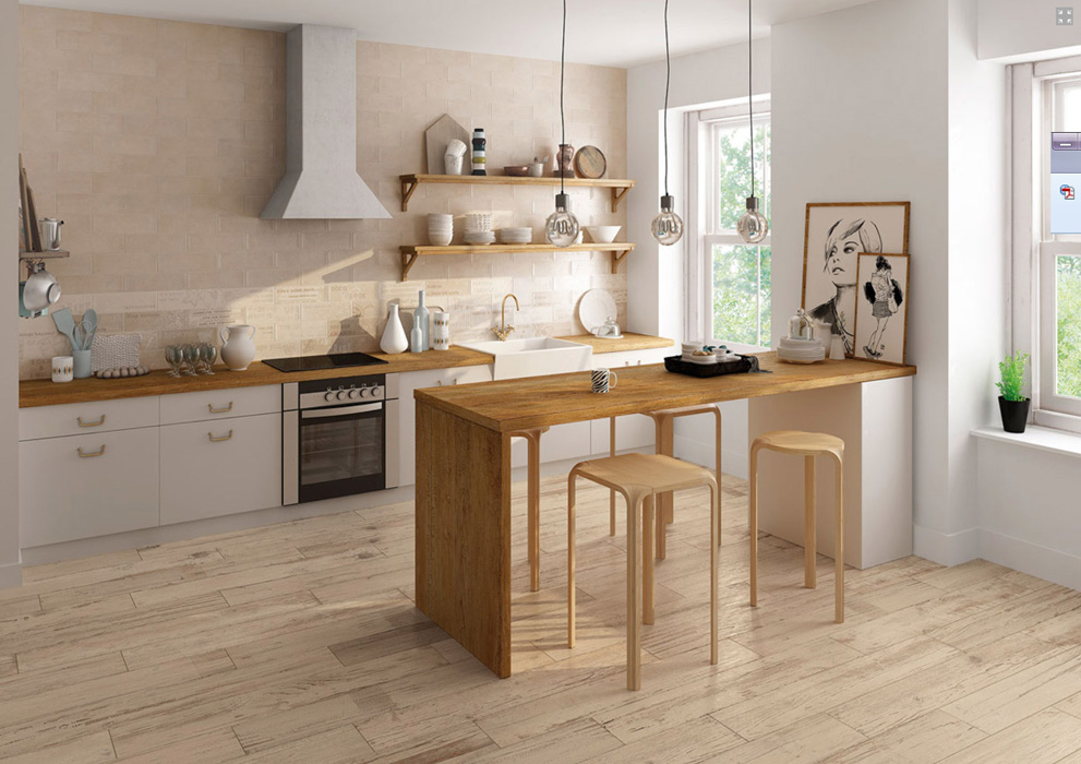 Главное отличие плитки Tribeca Blanco от остальных - яркий белый оттенок. Чаще всего плитка под дерево выпускается в светло бежевом исполнении, даже когда имитирует беленый дуб. Tribeca же по-настоящему белая. Материал отлично подойдет для кухни в стиле прованс и современных интерьеров. Белый цвет удачно сочетается с декорами Ker-Av (показаны на фотографии).