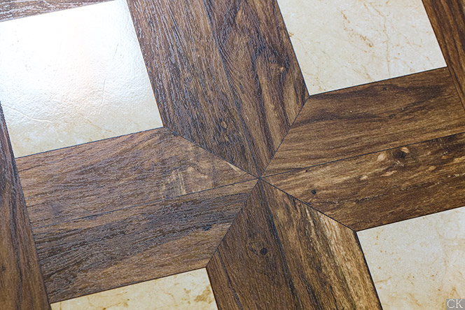 Обычно декор используют по центру комнат, или вставляют в шахматном порядке между фоновой плитки.