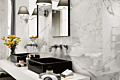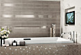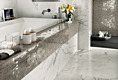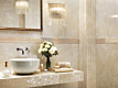 В большом размере к фоновой плитке можно добавить декоры Marvel Bronze Wallpaper (декор с резными узорами), Marvel Moon Line, Marvel Champagne Line (декоры с блестящими полосками), Marvel Beige Brocade, Marvel Bronze Brocade (фактурные декоры с эффектом мат-глянец) и Marvel Champagne Wave (геометрический декор).