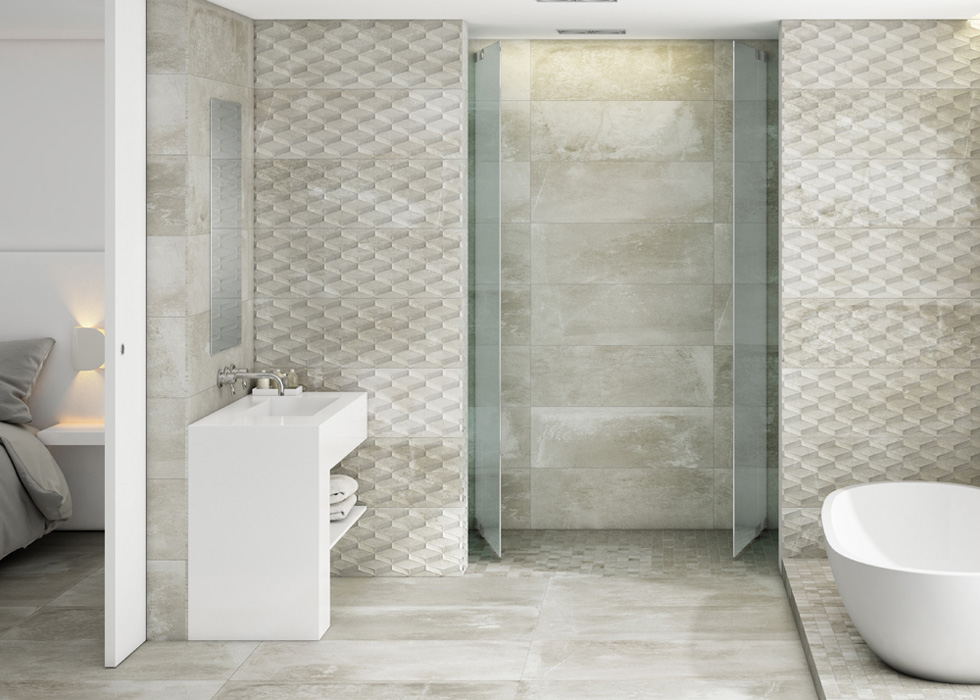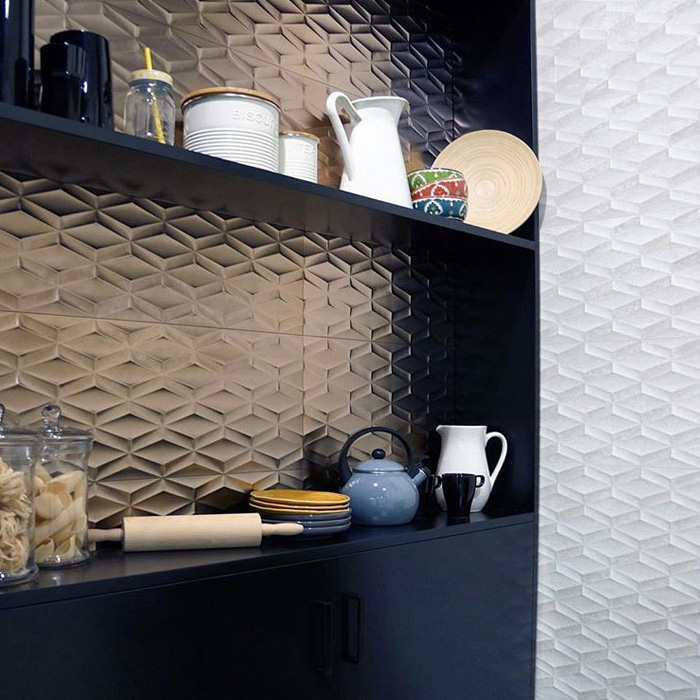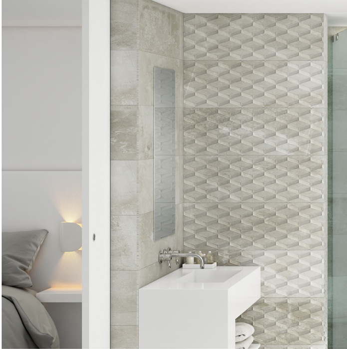 Фоновая плитка Mixing Wall от Aparici представлена в двух оттенках Ivory, Grey и двух поверхностях: традиционной гладкой и более фактурной с повторяющимся ромбовым орнаментом Rhombus. В качестве декоративных элементов предлагаются роскошные фактурные, покрытые драгоценными металлами декоры: серебряные Neutral Silver Rhombus 29.75x89.46 см, золотые Neutral Gold Rhombus 29.75x89.46 см, бронзовые Neutral Copper Rhombus 29.75x89.46 см.