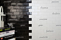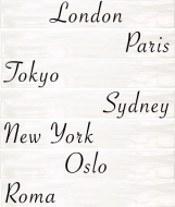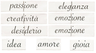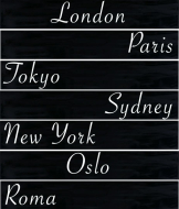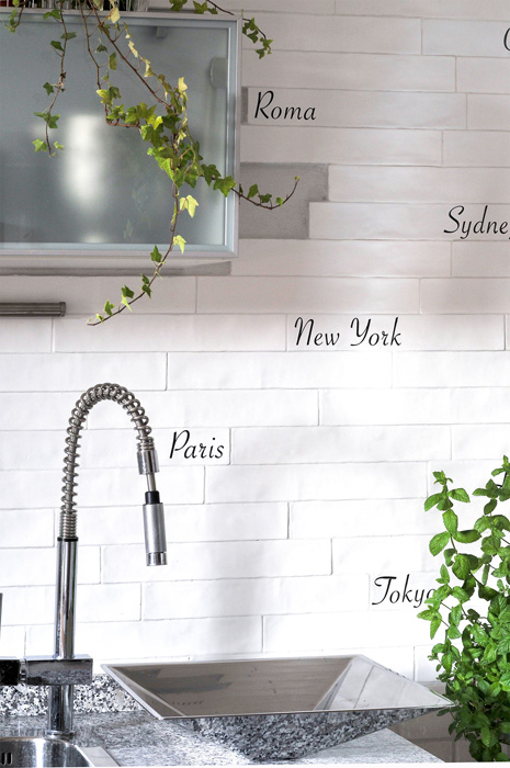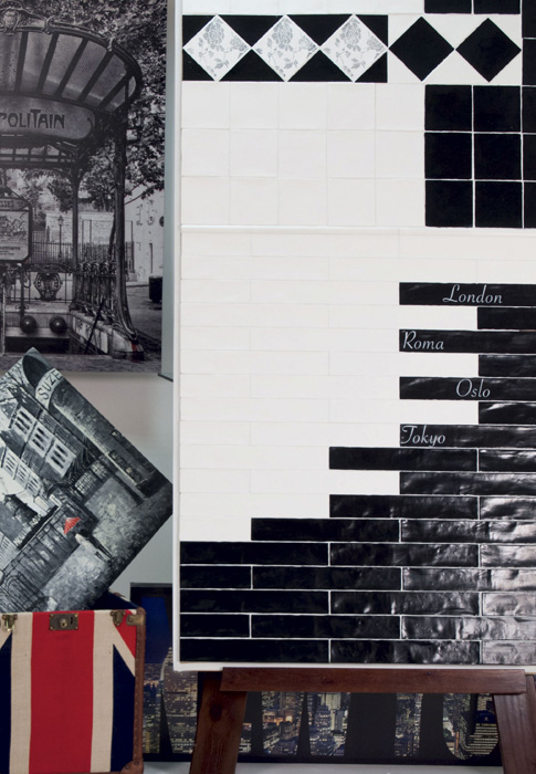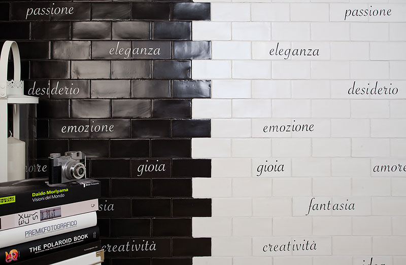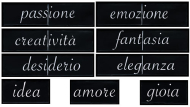 2. Dolce vita 6,5x13 см Parole/words в цветах Bianco и Nero, состоящие из девяти вариантов. 3. Cities 6,5x39,6 см Parole/words/mots (семь вариантов Столиц Мира) в цветах Bianco и Nero.