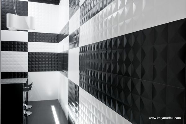 6. Уникальная поверхность в виде множественных граней с использованием ручного труда - Aparici Neutral Guiza Taco 15x15 см (Negro, Blanco). Крупноформатные Neutral Guiza 29.75x89.46 см (Blanco, Rojo, Negro). Декоративные элементы с напылением драгоценных металлов платины и золота – Neutral Guiza 29.75x89.46 (Plata, Oro). Комбинирование оттенков фоновой плитки и декоративных элементов – дает футуристичный эффект в стиле постмодернизма. Толщина 8.7 мм.