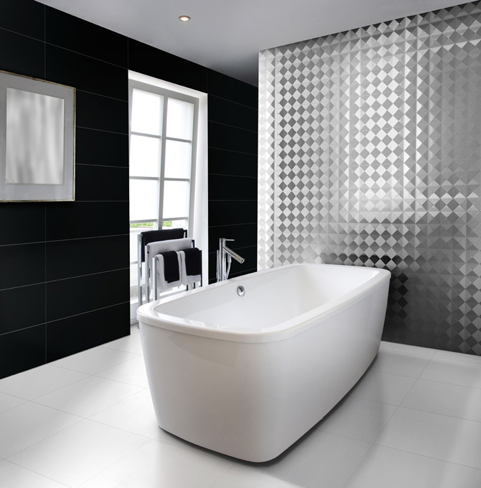 7. Нежная романтика в стилеарт-нуво – серия Neutral Day-Night. В этой серии предлагается глянцевая мозаика на сетчатой основе Trace Mosaico 29.75x29.75 см с размером каждого кубика 2.5x2.5 см (Blanco, Negro). Фоновая плитка толщиной 7,3 мм выполнена в цветовой палитре: