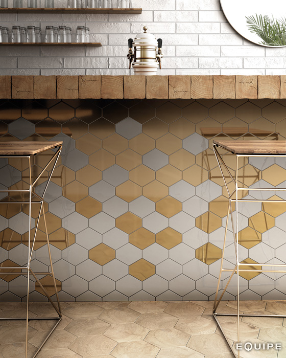Шестиугольная плитка Benzene напоминает наклонные шестиугольники, что привносит в дизайн креативный дизайнерский эффект. Фабрика рекомендует экспериментировать с цветом для создания композиции и изменеия конфигурацию помещения. Плитка Benzene не боится влажности и бытовых химикатов, отличается 5-ым классом устойчивости к загрязнениям, отличается жаропрочными свойствами, что важно при укладке на рабочей зоне кухонного фартука. С помощью коллекции Bezene возможна облицовка камина и дымохода. Плитка золотого оттенка Metallic понравится любителям люкс облицовки в стиле арт-деко и фьюжн. Плитка Benzene рекомендуется как фон к коллекции Magical 3.