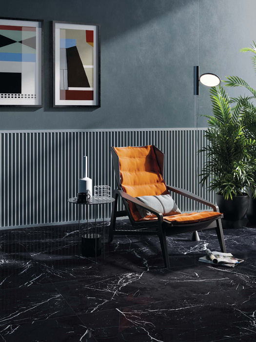 В качестве декоров можно использовать матиты – тонкие плоские карандаши формата 0,5х120 см. Они выпускаются в пяти оттенках – черный, белый, алюминий, бронза и медь. Также в коллекции доступны спецэлементы: плинтуса, ступени и угловые ступени.