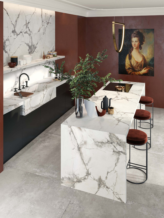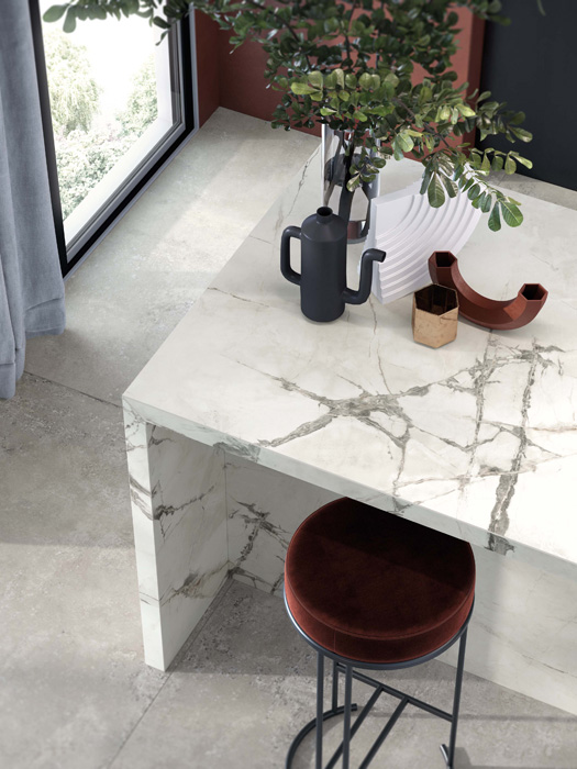 Варианты для столешниц: вы можете заказать керамогранит Sensi Up в формате 163,5х323 см, в толщине 12 мм. Этот размер не ректифицирован, он выпускается для дальнейшей обработки при изготовлении мебели.