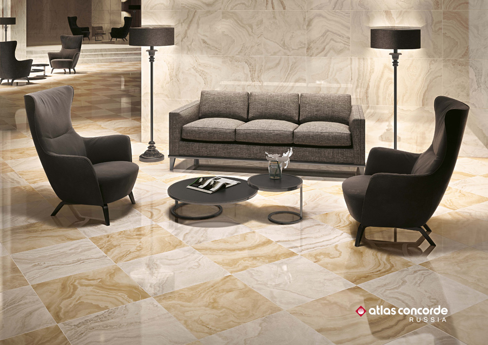 Коллекция отличается сильно выраженными слоями ониксового рисунка и может стать роскошным украшением любого зала или входной группы. Серия выпускается из керамогранита полной прокраски и может использоваться как в частных, так и в коммерческих помещениях.