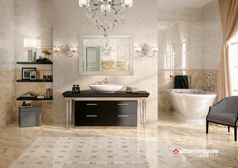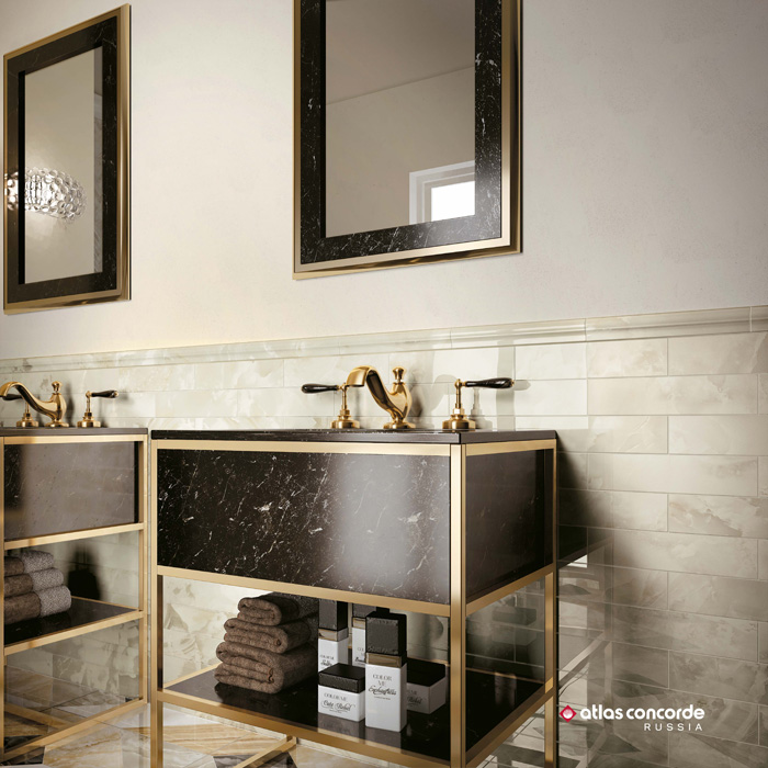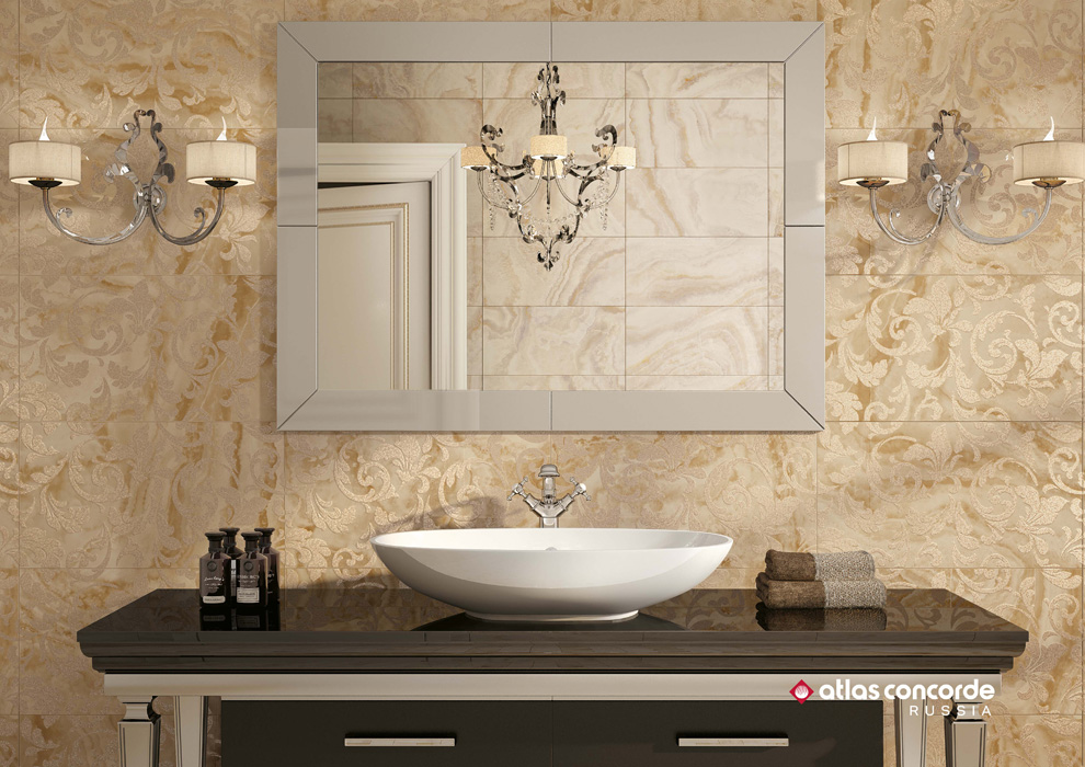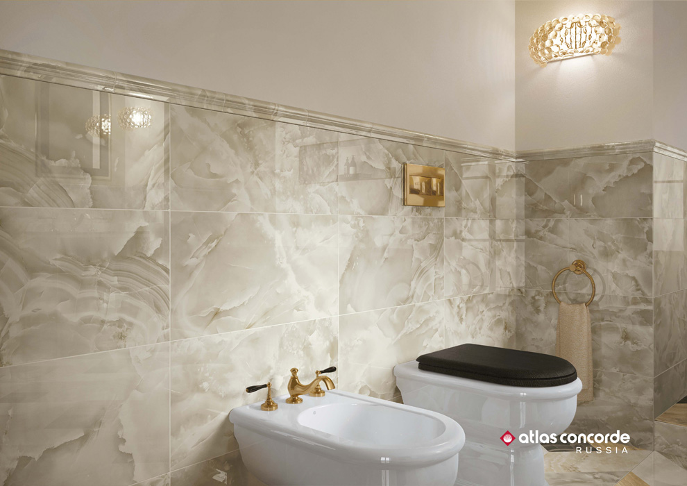 Фоновая плитка Supernova Onyx Wall от Атлас Конкорд изготовлена из традиционной для итальянской керамики белой глины двойного обжига и представлена в двух размерах толщиной 8,5 мм: 31,5х57 см и 8х31,5 см. Размер 8х31,5 см выполнен только в цвете Royal Gold и Persian Jade. Поверхность плитки покрыта глянцевой глазурью с завораживающей глубиной и естественными прожилками полудрагоценного камня. Самые редкие и ценные виды натурального оникса вдохновили творческую команду Atlas Concorde к созданию стилистически уникального материала с огромным количеством декоративных элементом для традиционной классики и современного направления: