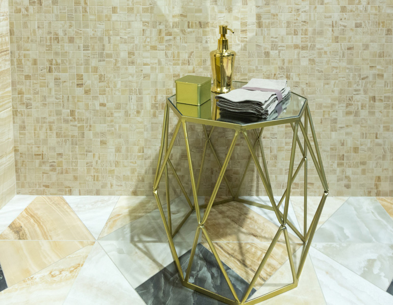 • Оригинальной мозаикой с эффектом «плетеной» поверхности S.O.Mosaic 30,5х30,5 см (Honey Amber, Black Agate, Persian Jade)