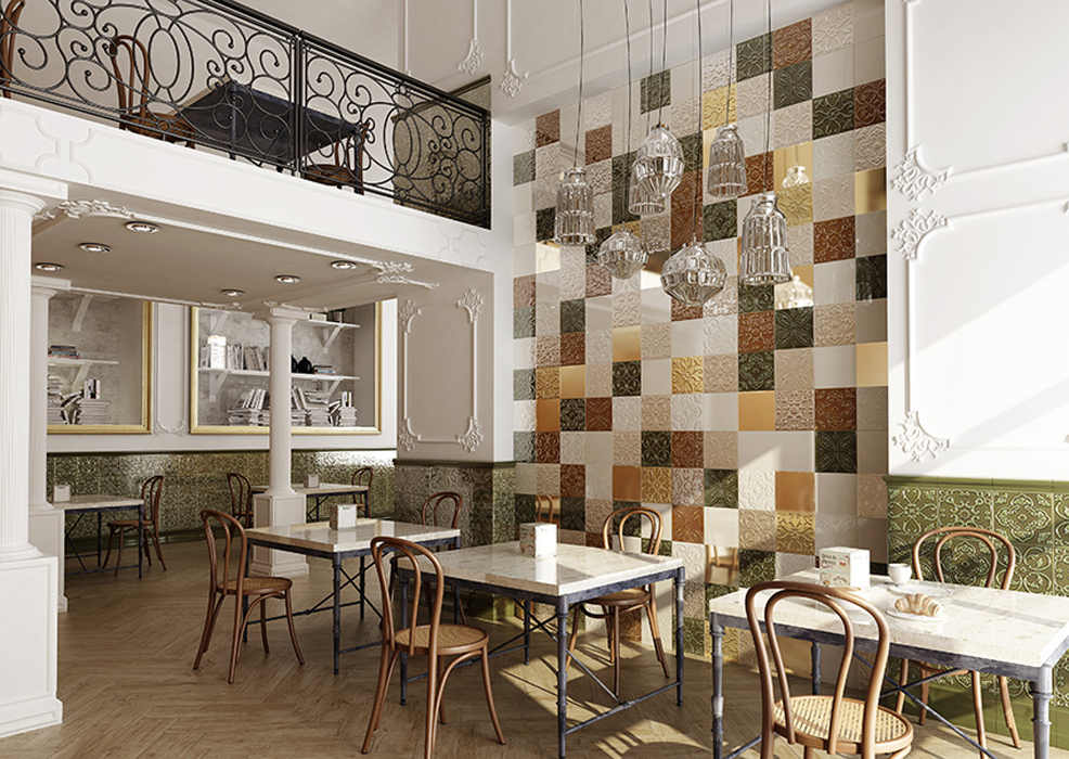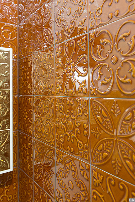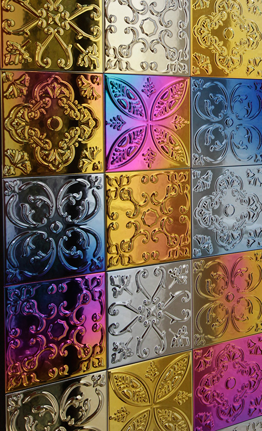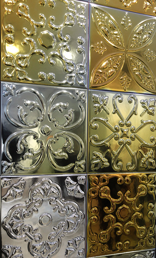 Особый шик придают декоративные элементы, выполненные с особой современной PVD технологии – системы нанесения частиц драгоценных металлов на поверхность плитки для серий: Trend Iris (перламутровая с серебром и золотом), Art Silver (гладкая серебряная), Art Gold (гладкая золотая), Trend Silver, Trend Gold, Trend Bronze.